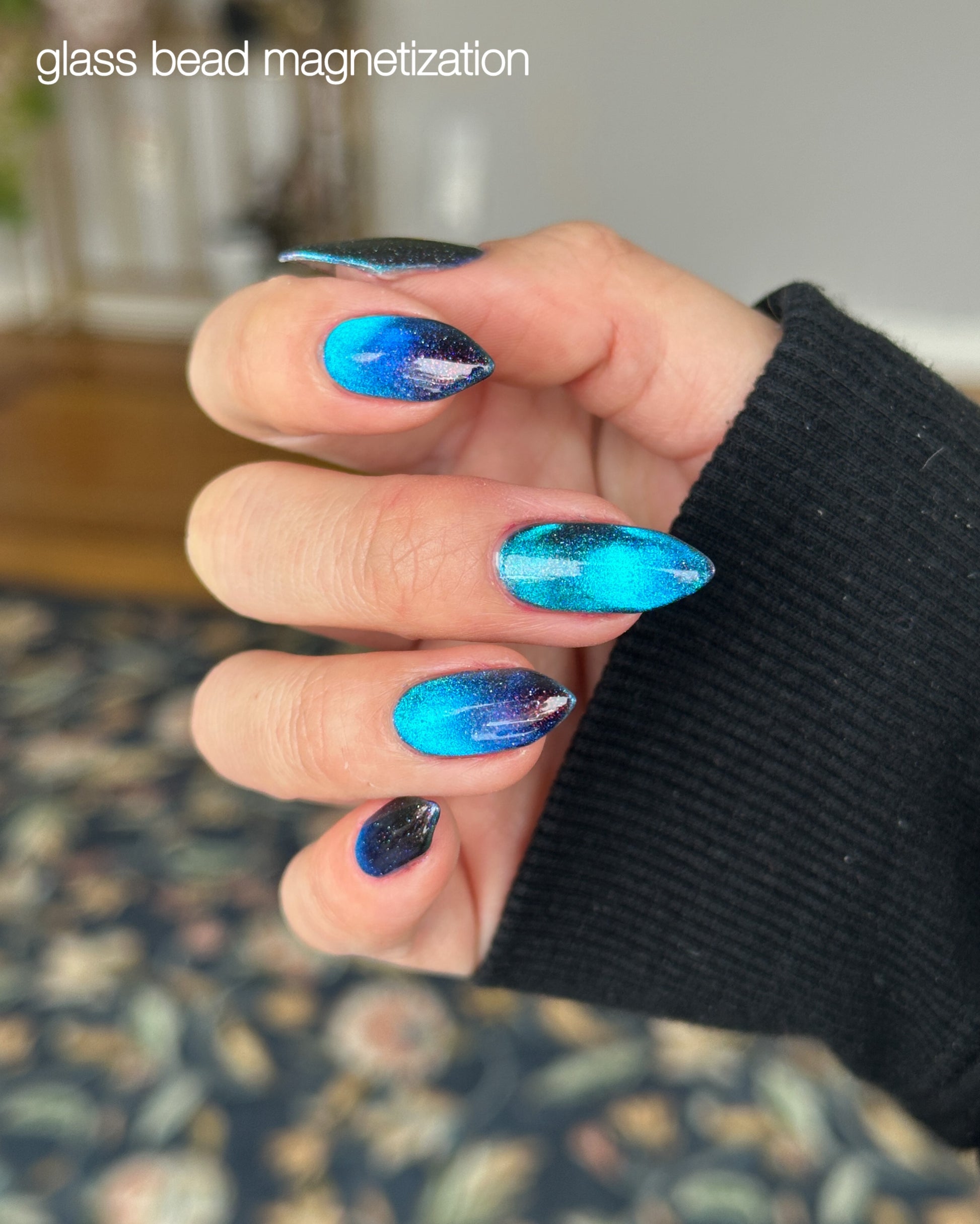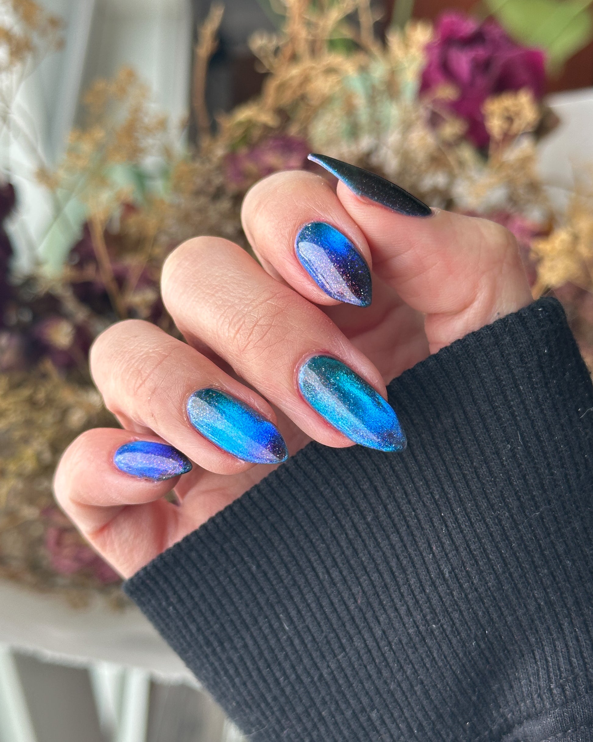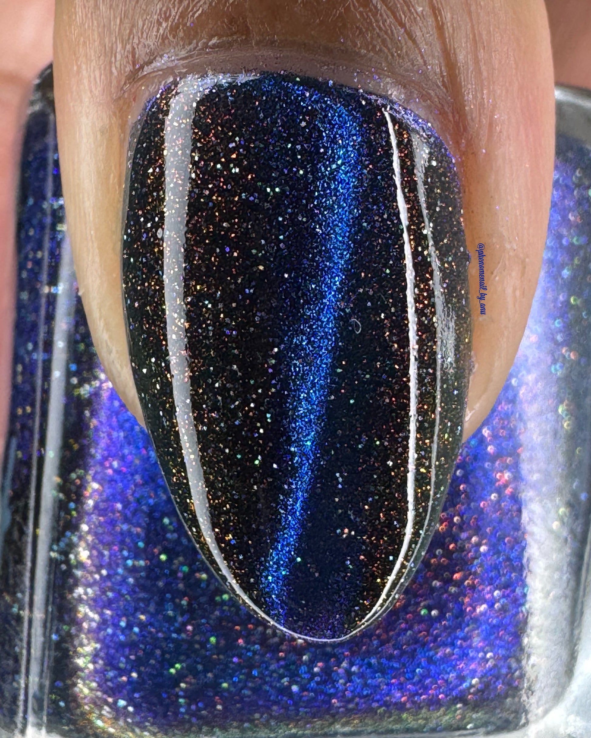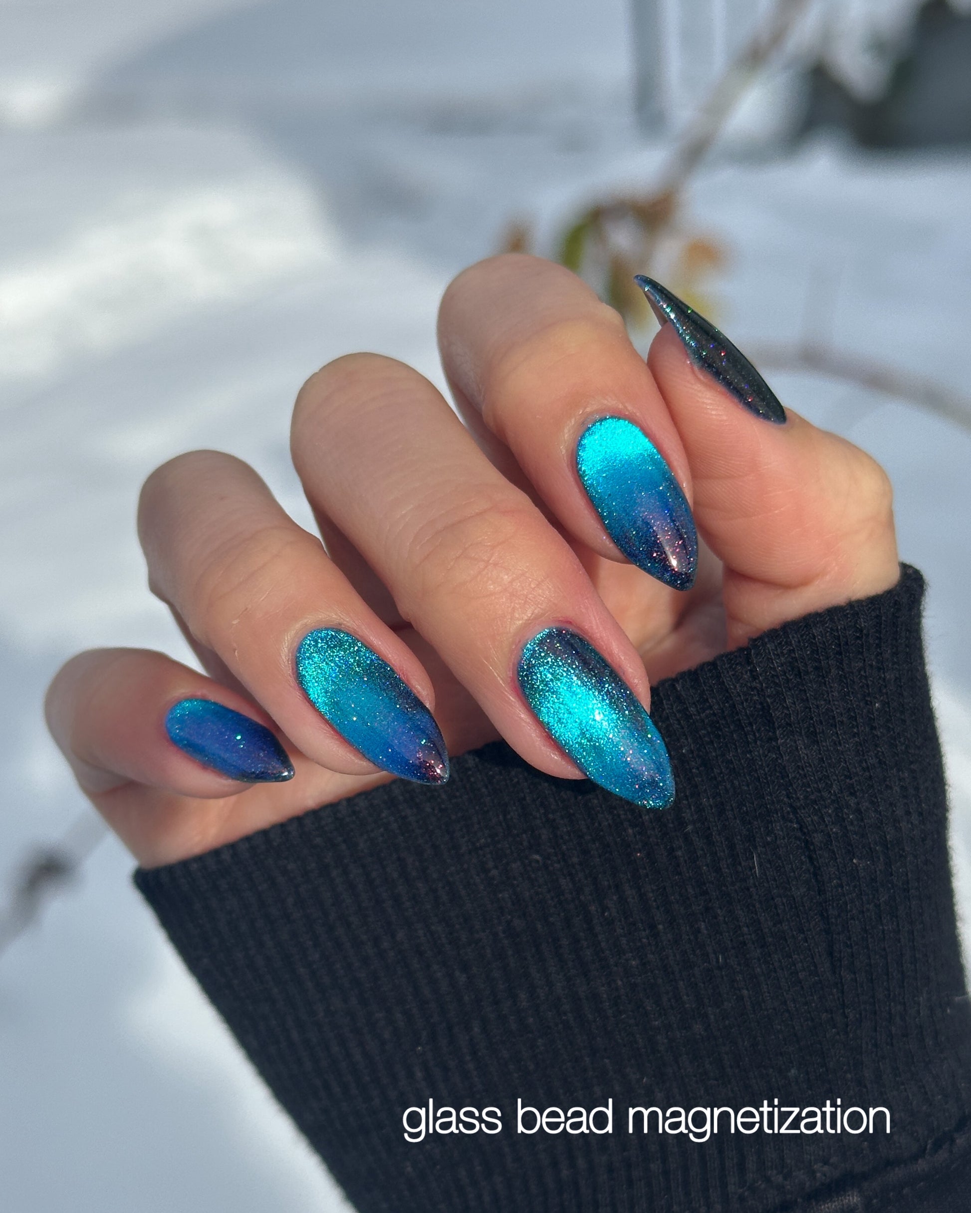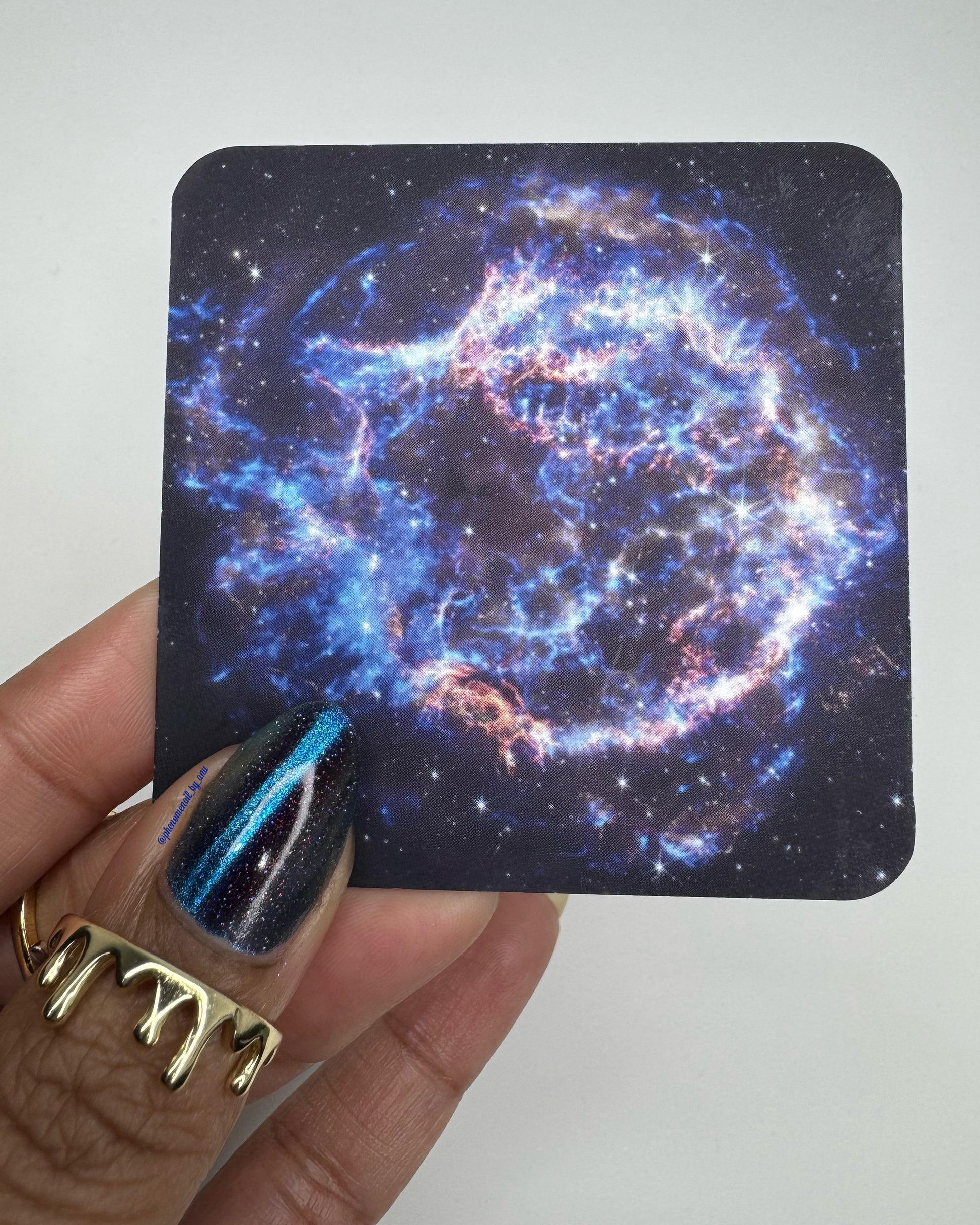 Cassiopeia A explodes with electric blue magnetic pigment that shifts to purple at extreme angles. Beneath the magnetic glow, scattered holo and orange shimmer sparkle against a black jelly base. Inspired by infrared imagery of the supernova remnant Cassiopeia A, this shade captures the contrast between searing light and deep space.
