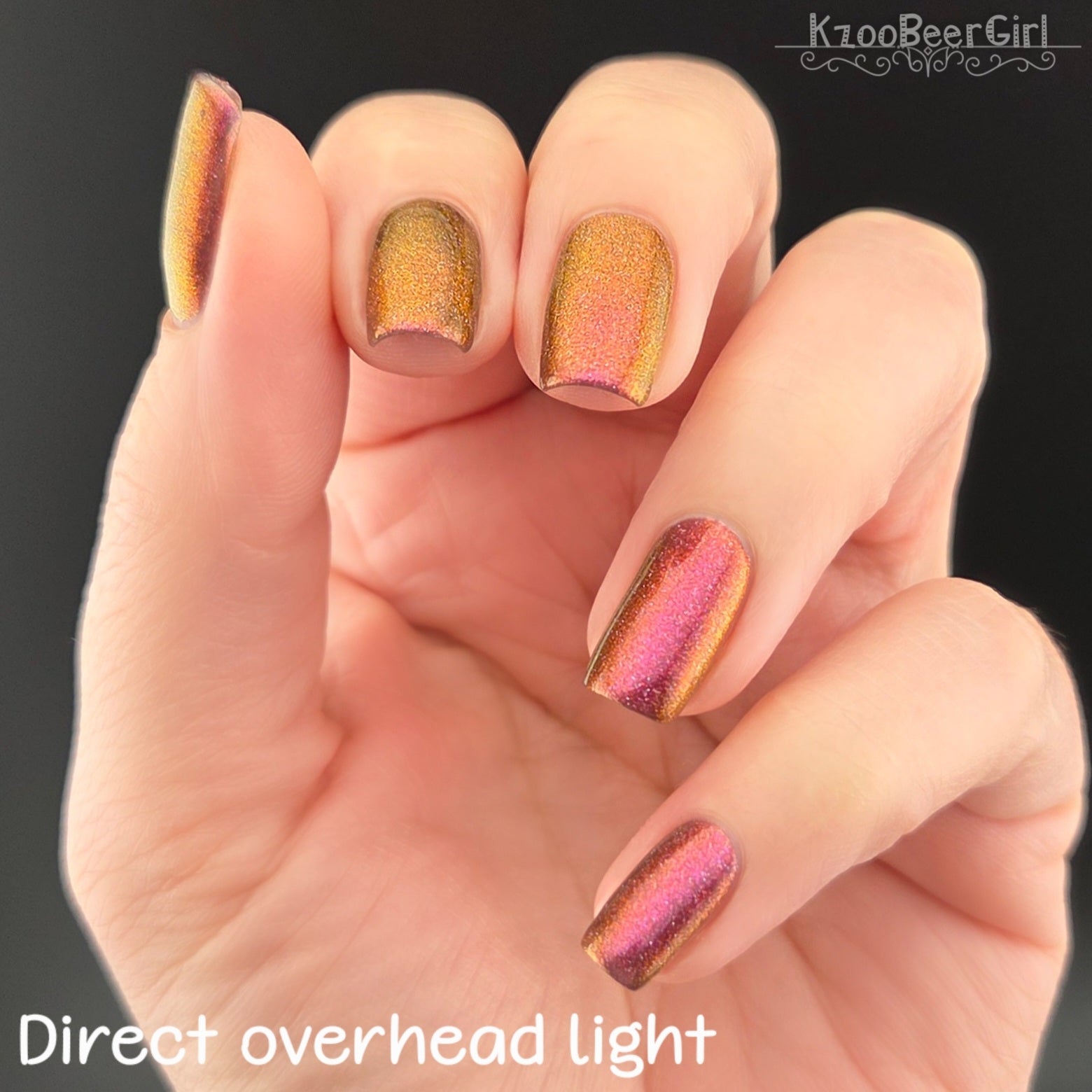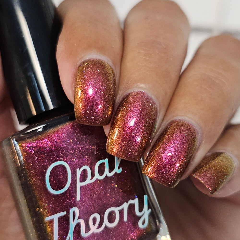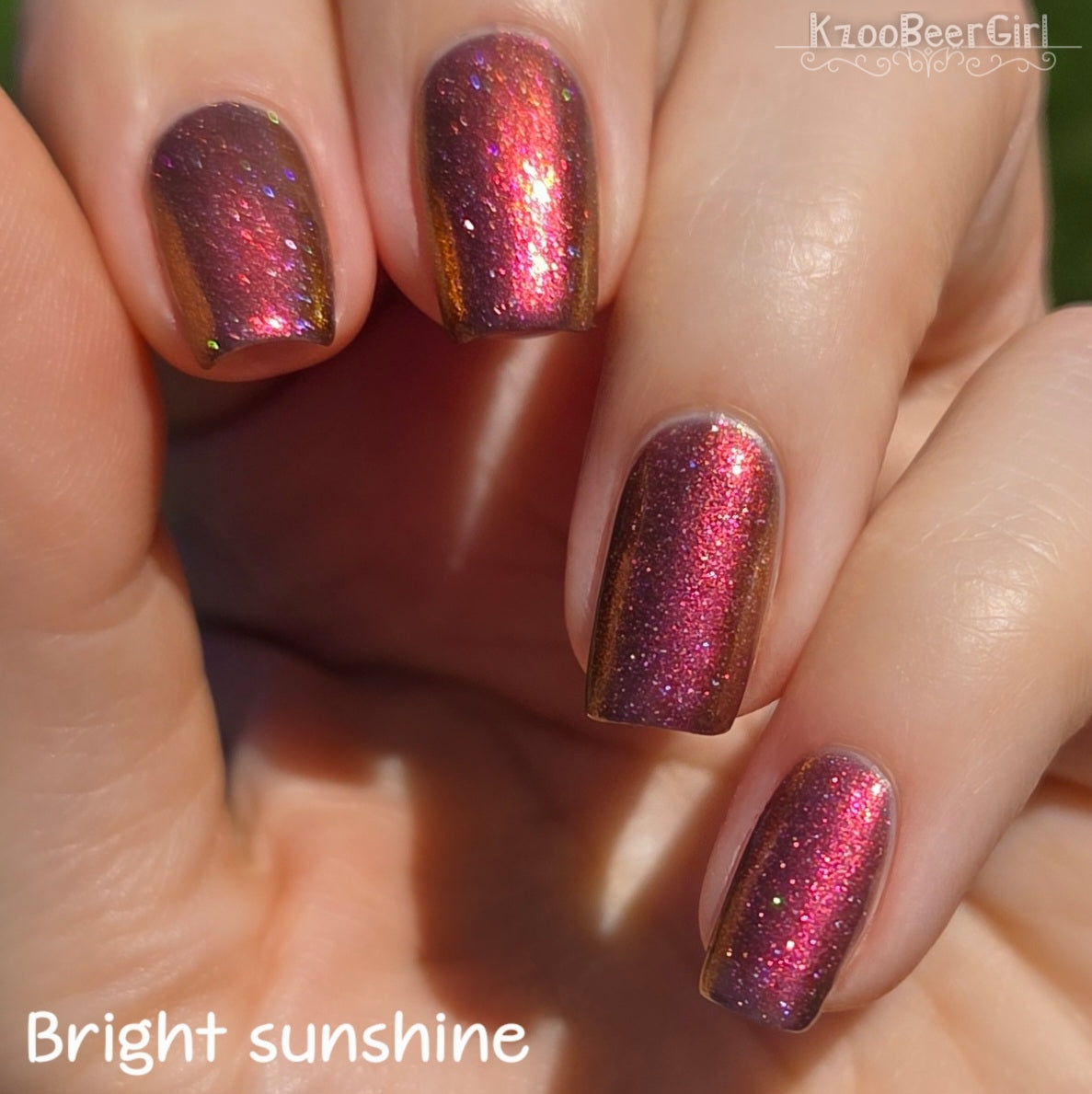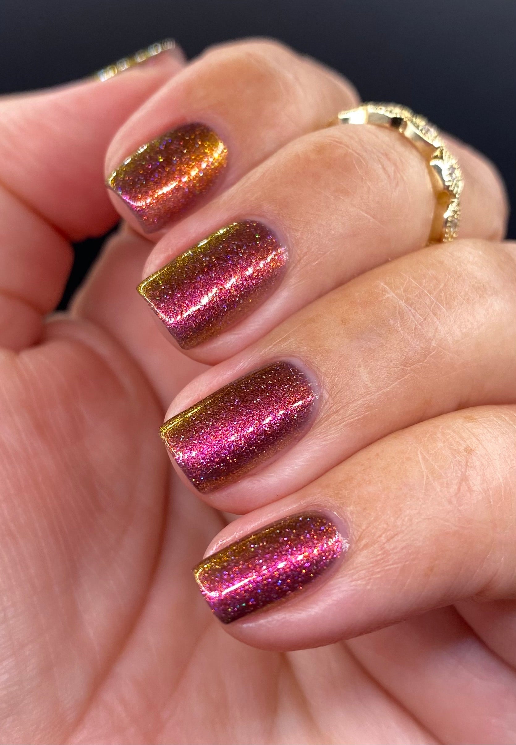Embers is a blackened dark red jelly with red-to-orange shifting shimmer and scattered holographic glitter. It's like a sunset you can wear on your fingertips. Perfect for autumn.