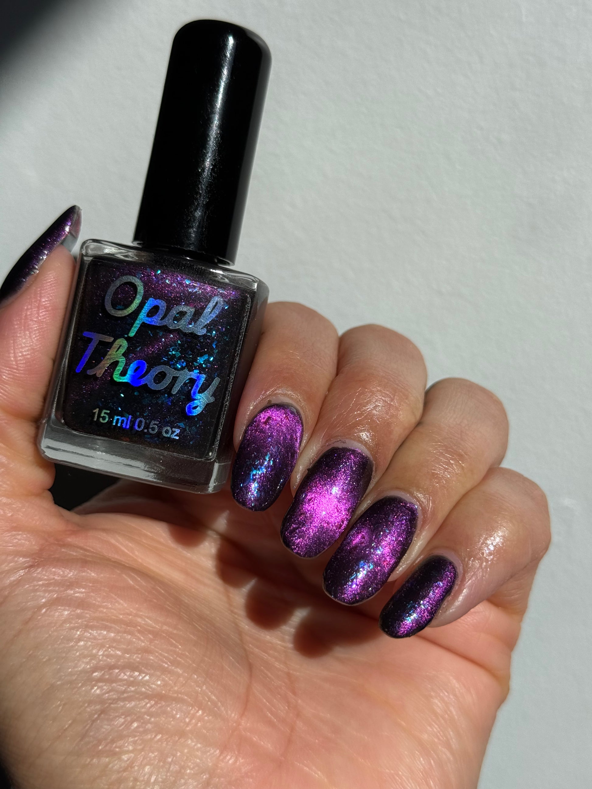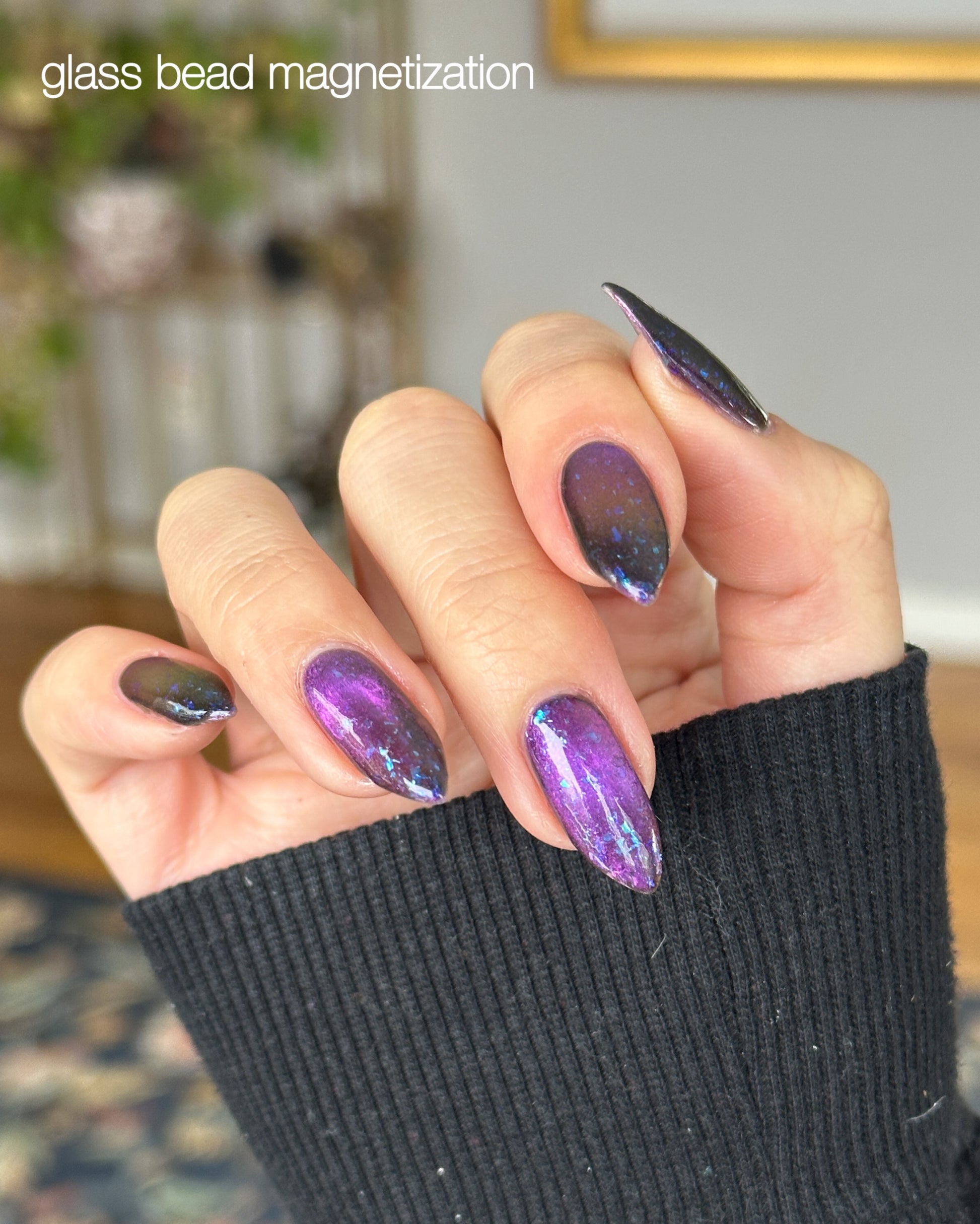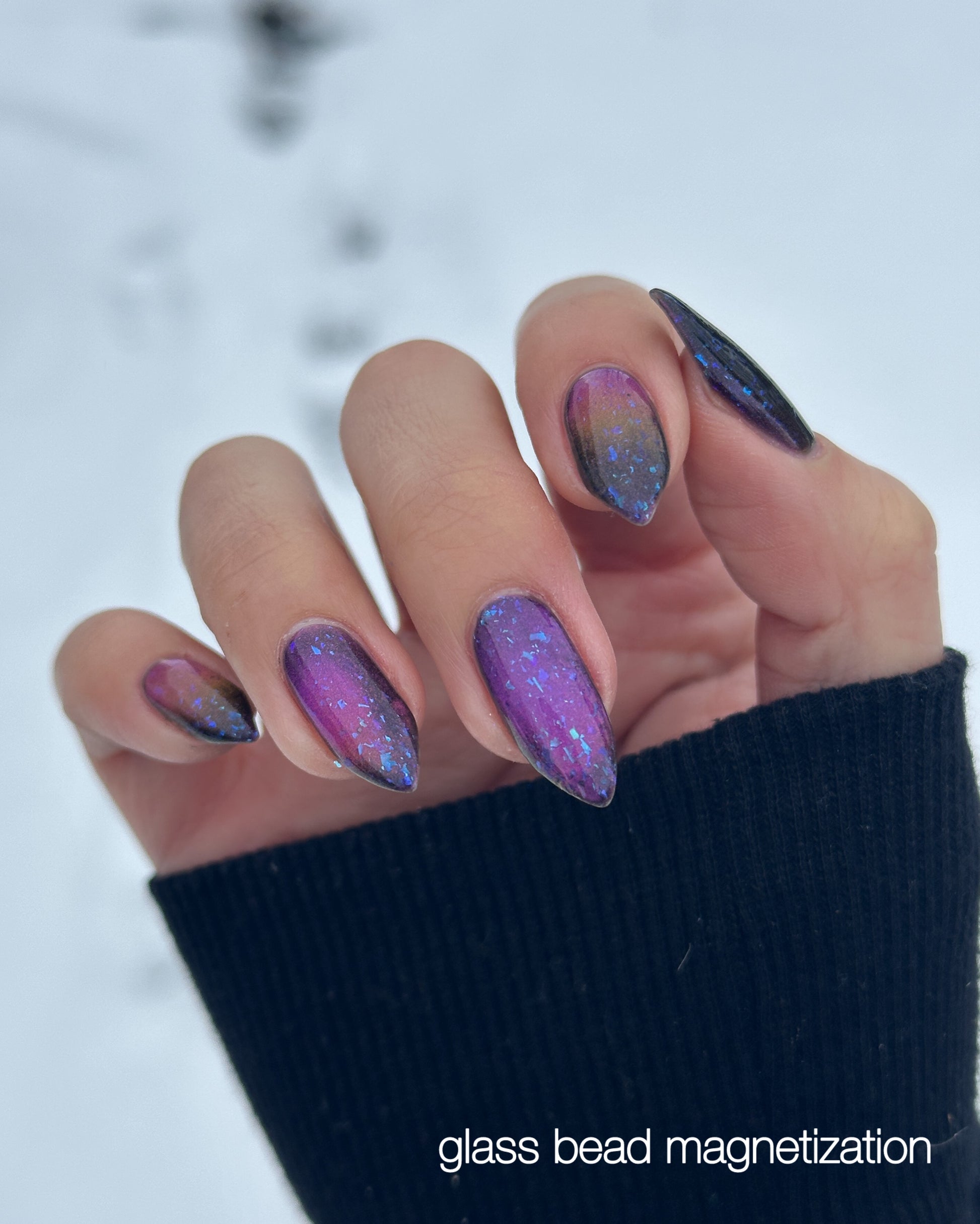 Sagittarius B2 features magenta-to-gold-to-lime shifting magnetic pigment over a black base, revealing scattered bright blue flakes that flash like newborn stars. Inspired by images of the dense dust clouds of Sagittarius B2, where luminous pink and magenta clouds glow against dark cosmic voids, pierced by brilliant blue starlight.