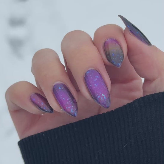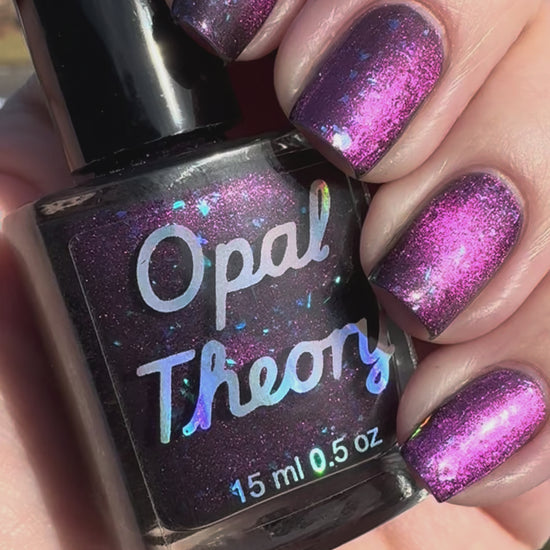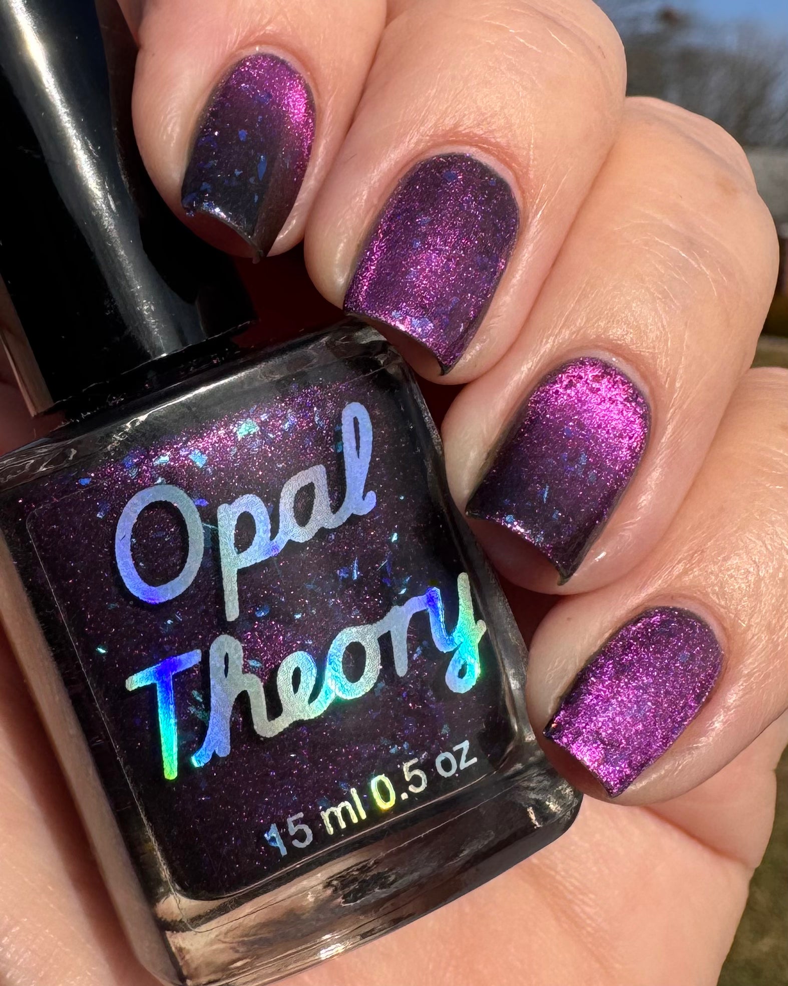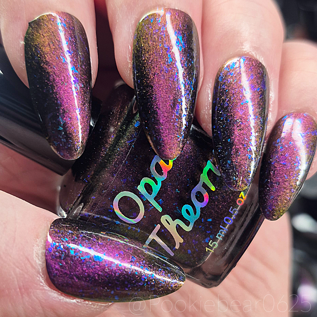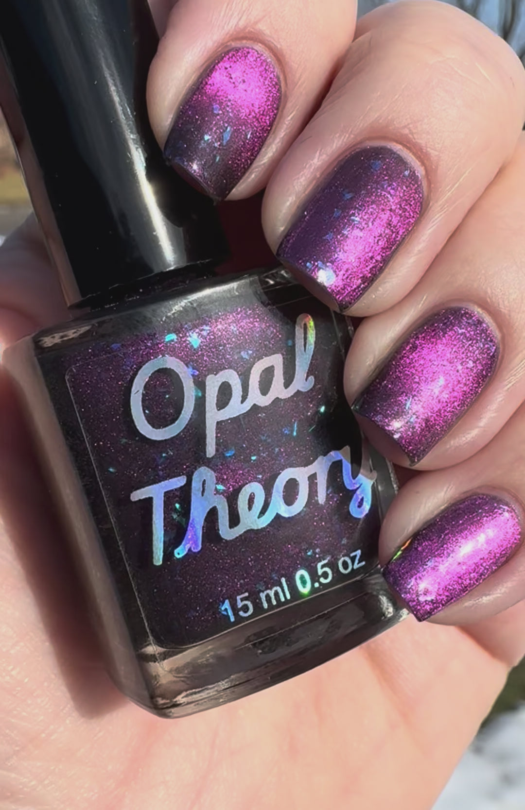 Sagittarius B2 features magenta-to-gold-to-lime shifting magnetic pigment over a black base, revealing scattered bright blue flakes that flash like newborn stars. Inspired by images of the dense dust clouds of Sagittarius B2, where luminous pink and magenta clouds glow against dark cosmic voids, pierced by brilliant blue starlight.