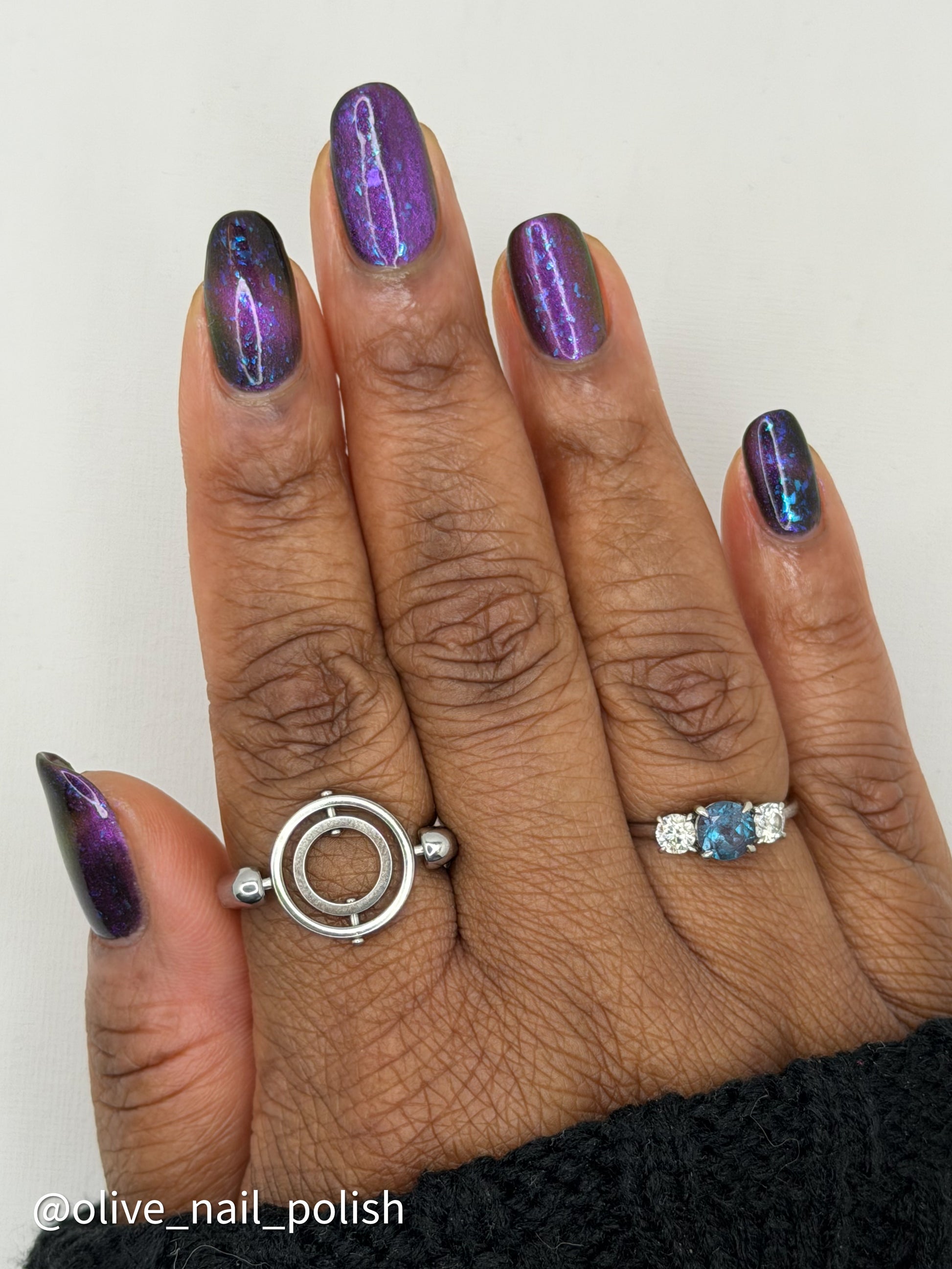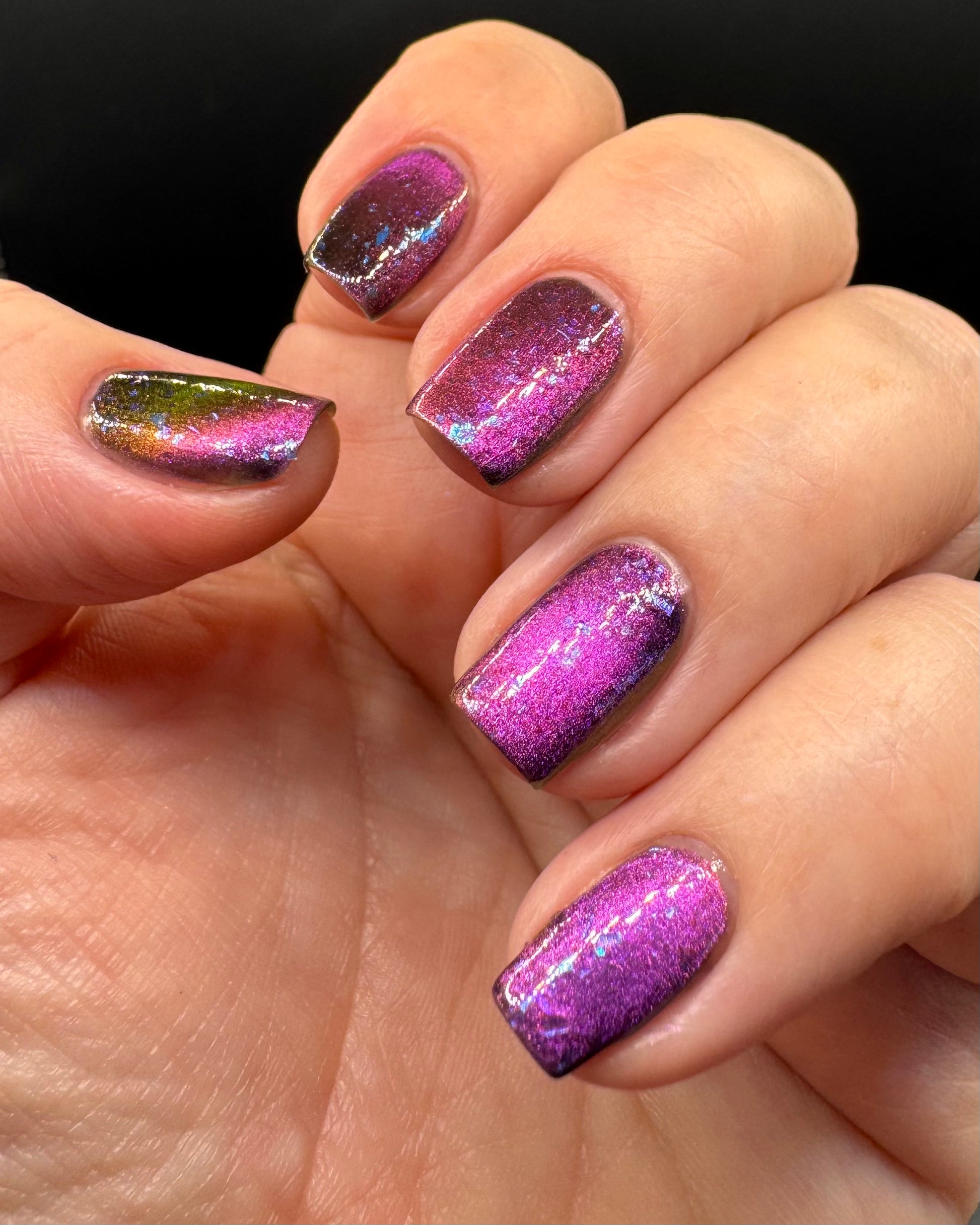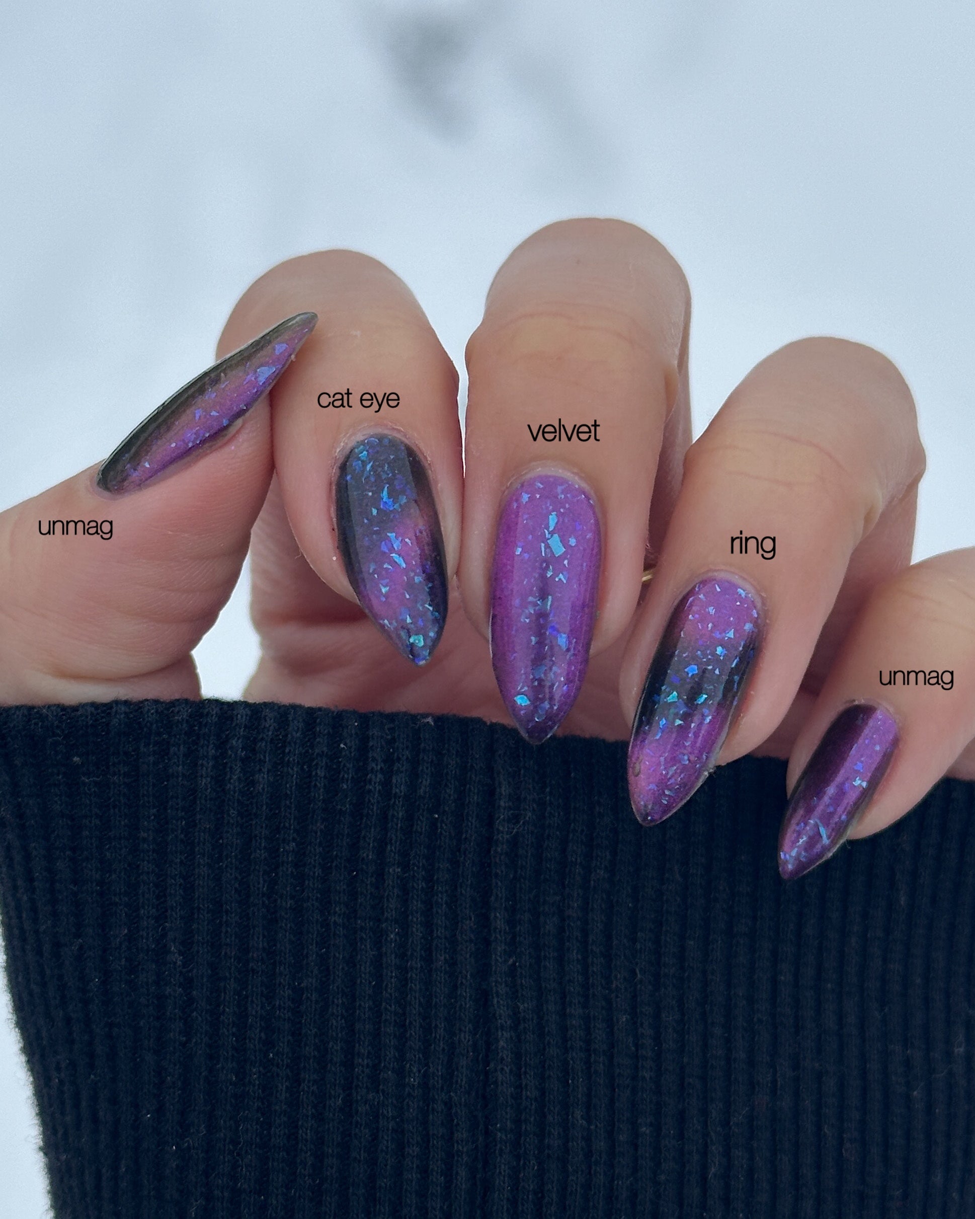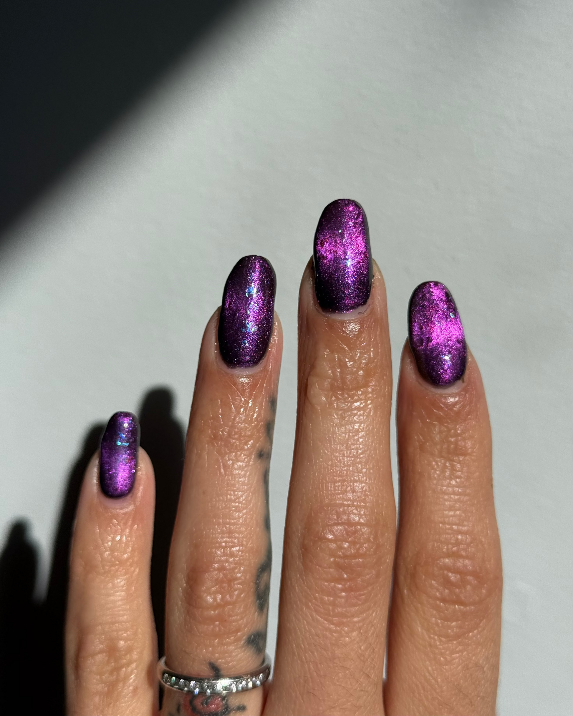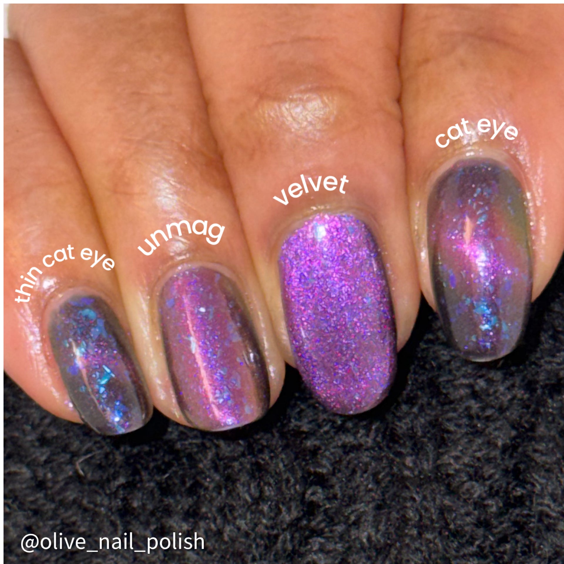Striking in velvet, but best mimics the inspiration in the cat eye effect. Full coverage in 2-3 coats.