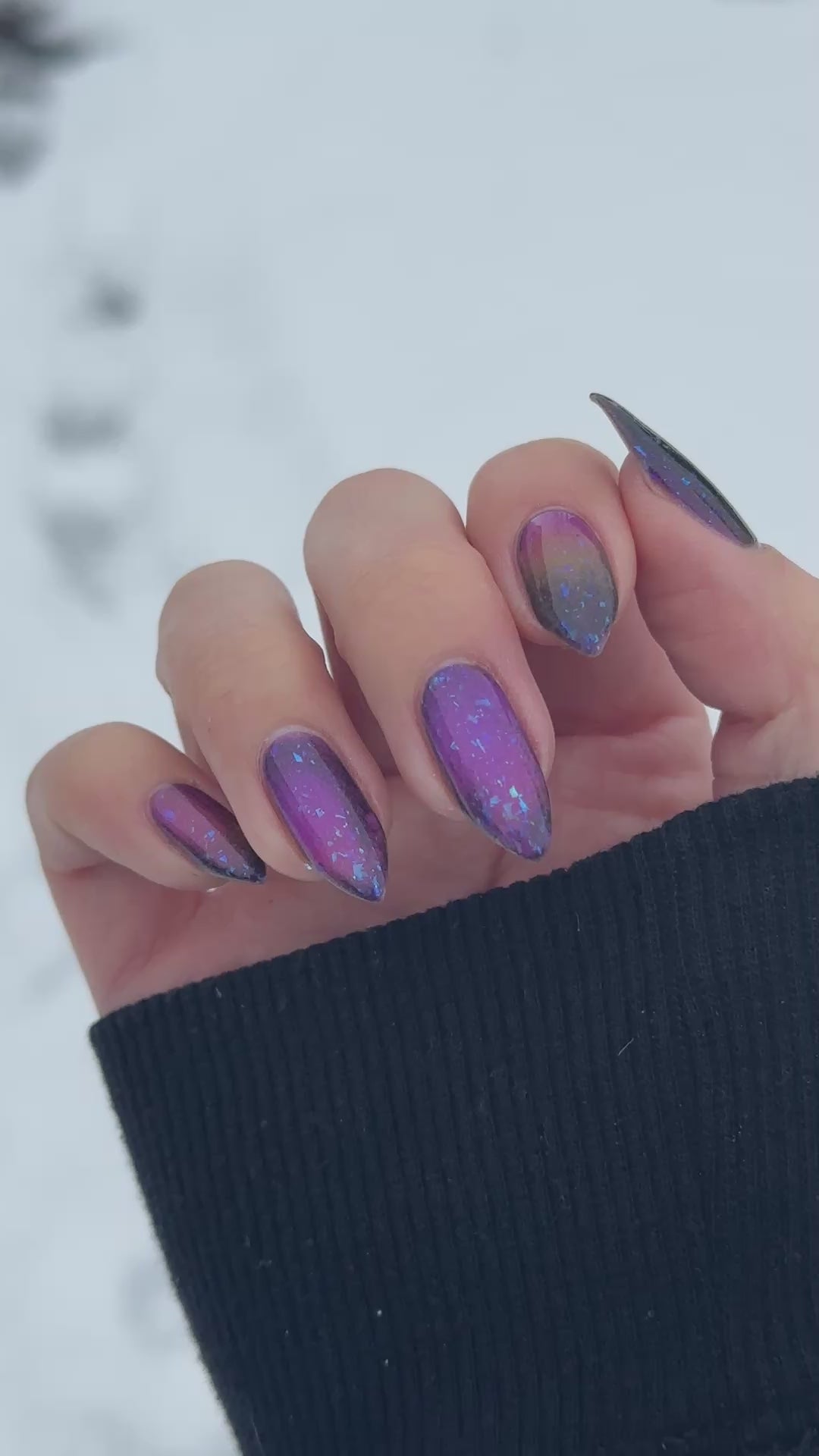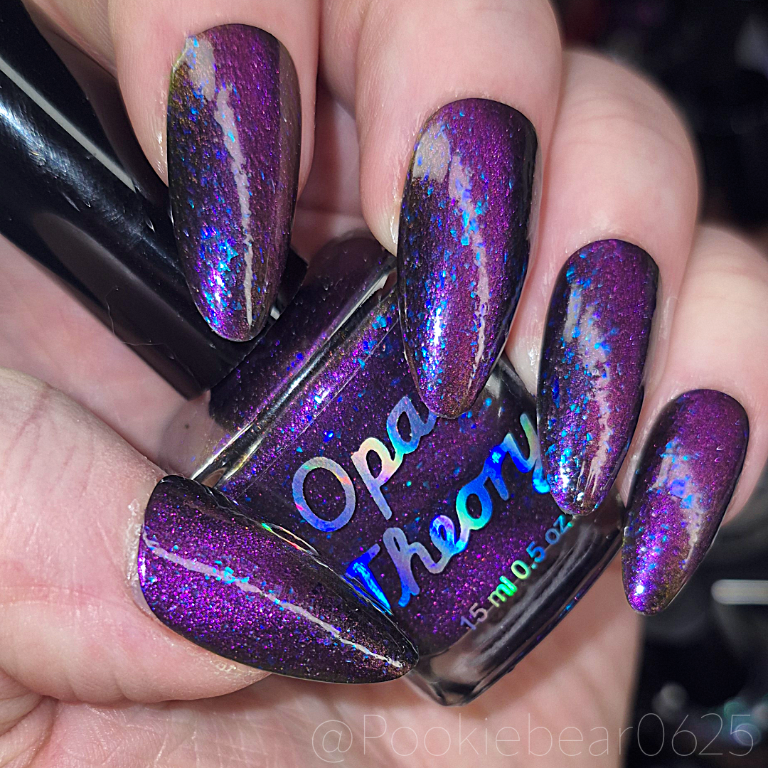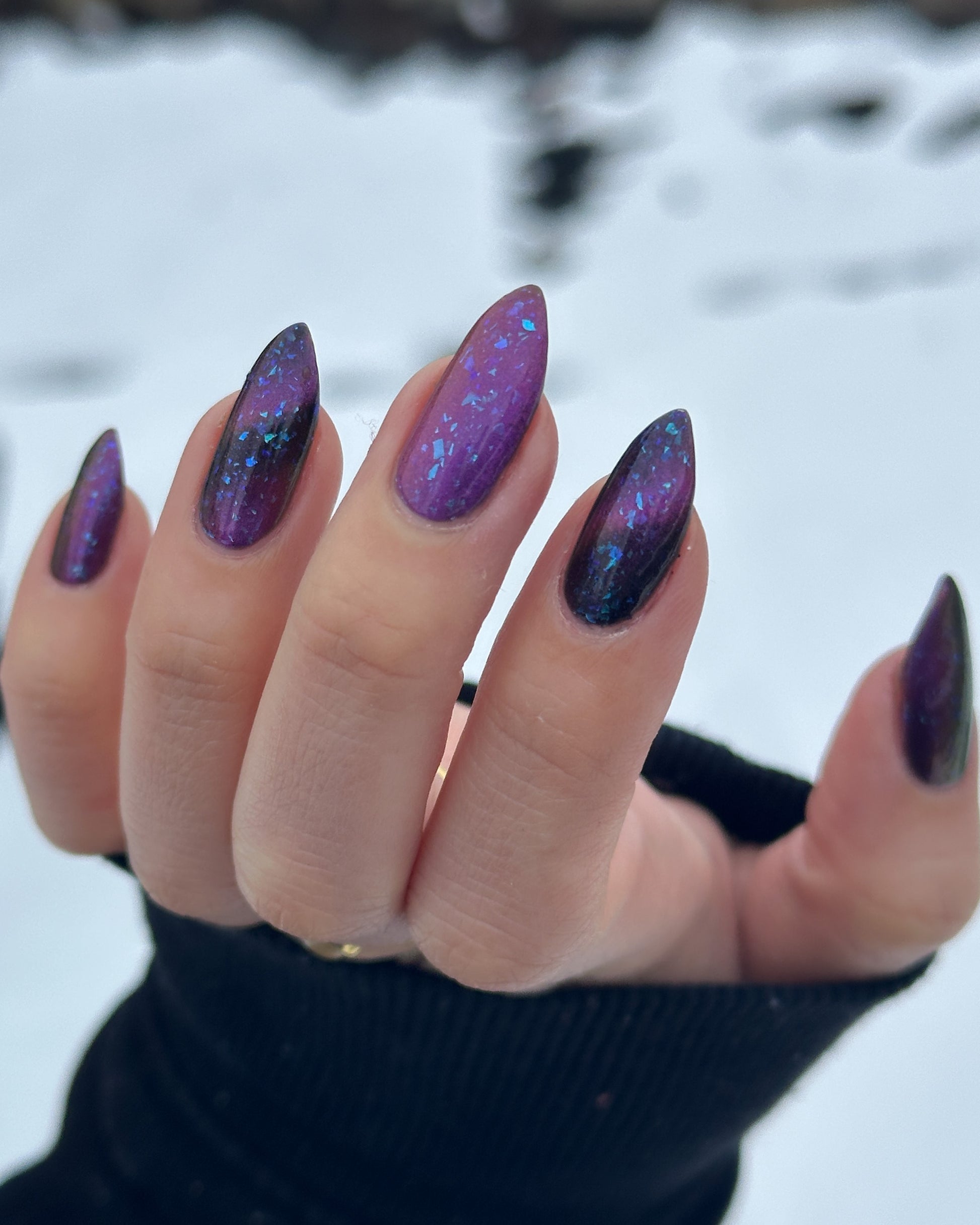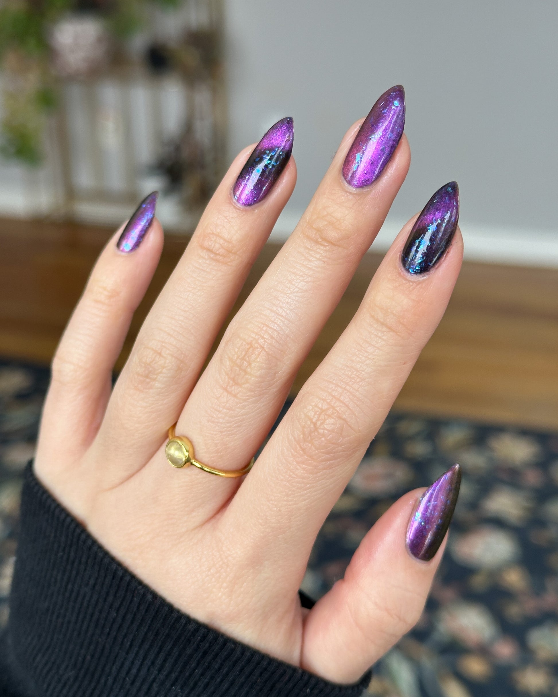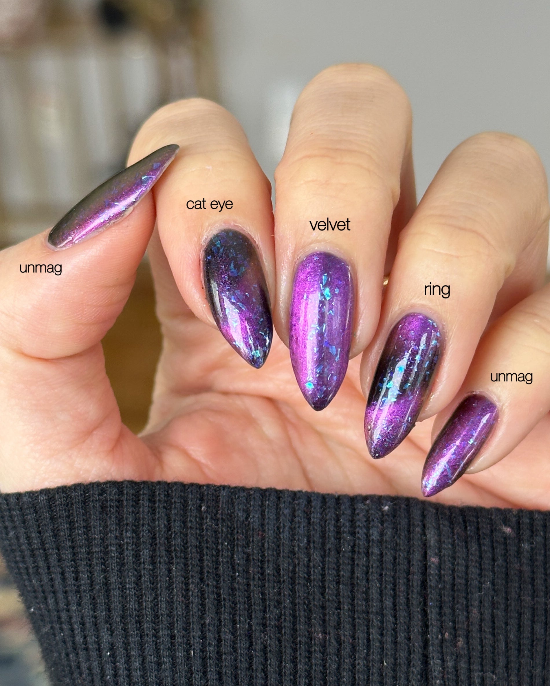 Striking in velvet, but best mimics the inspiration in the cat eye effect. Full coverage in 2-3 coats.