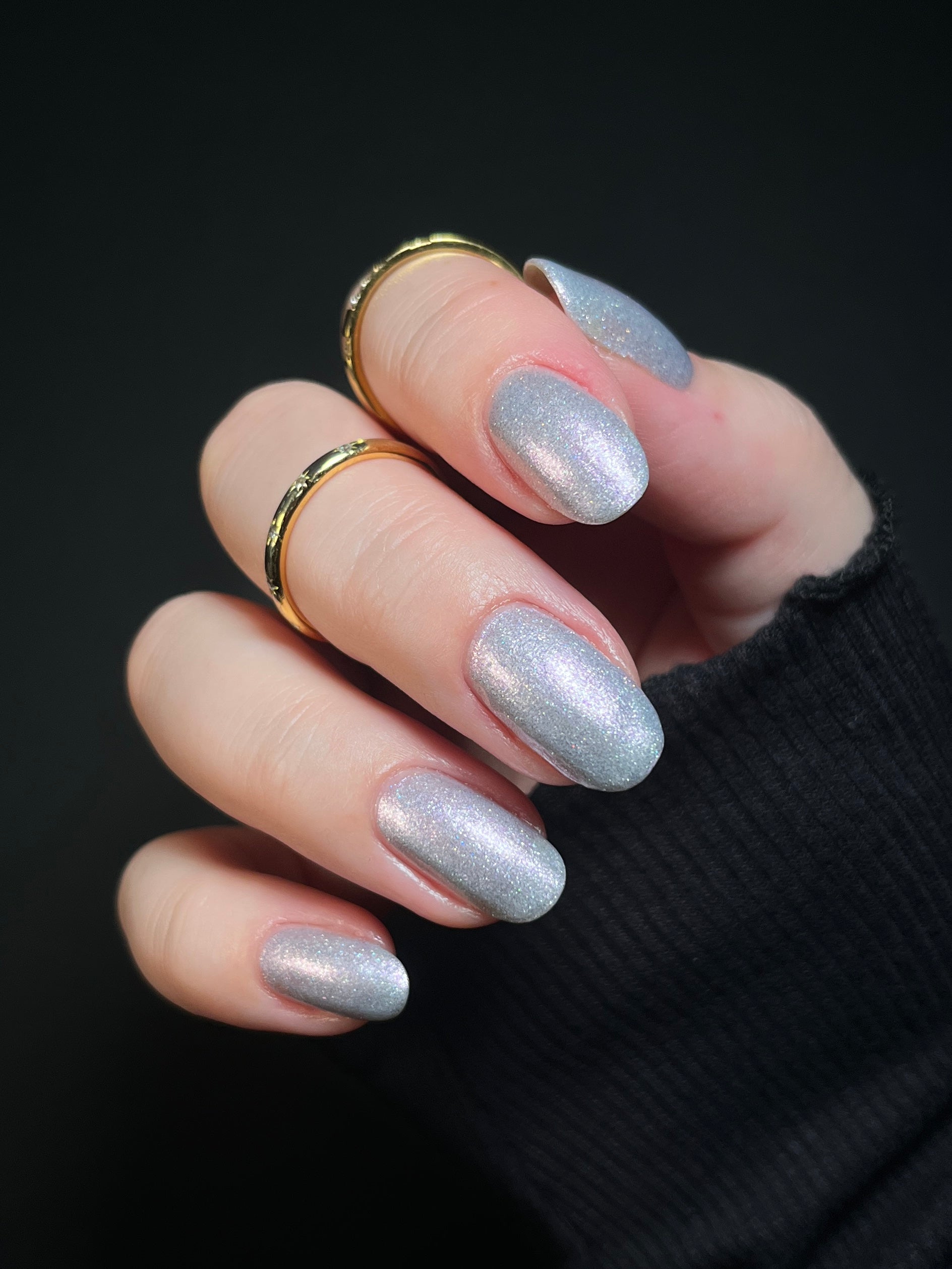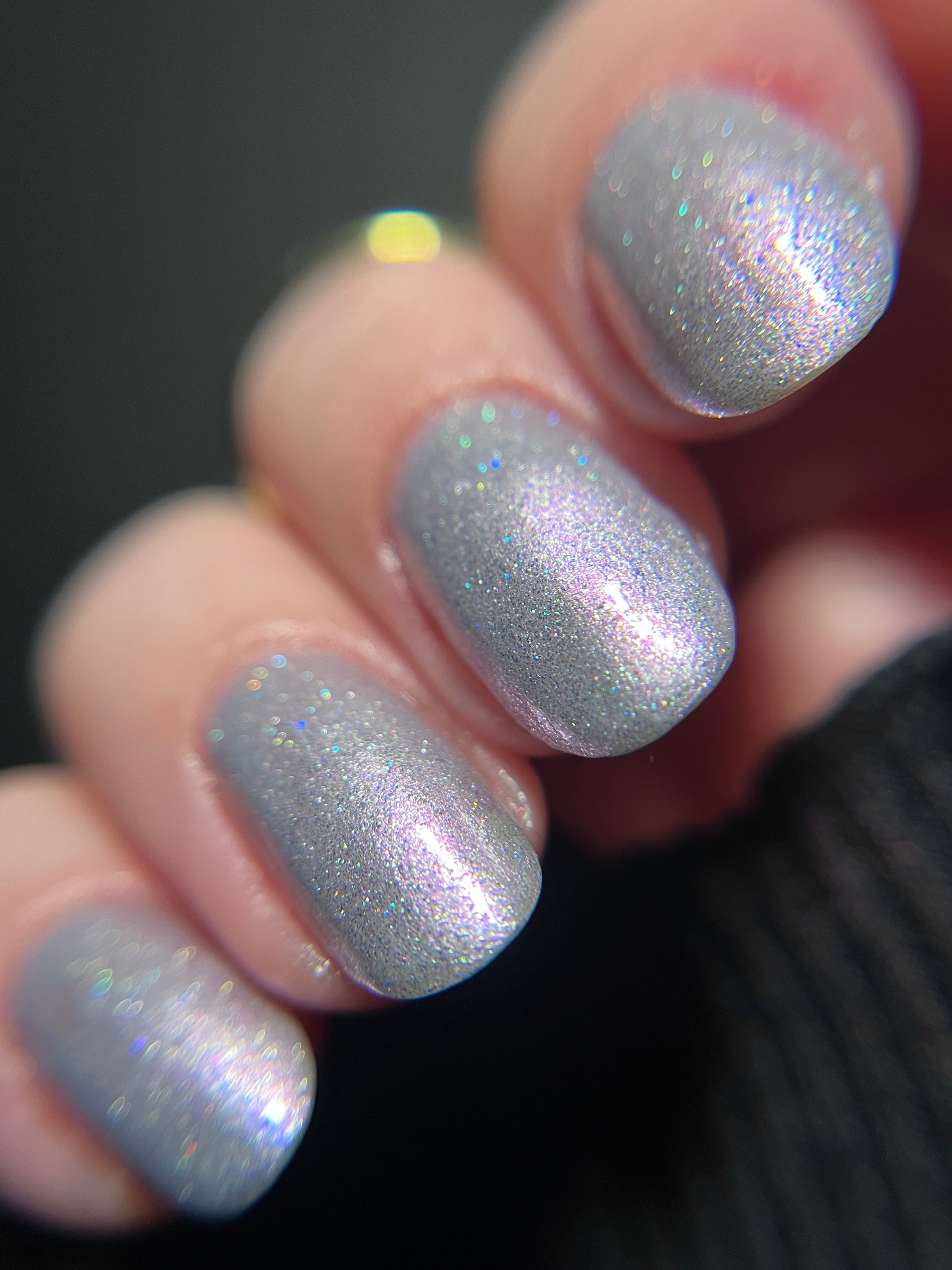 Silver Bells is a glowy silvery crelly with purple shimmer and small purple holographic glitter. Imagine the ringing bells from the classic "Carol of the Bells."