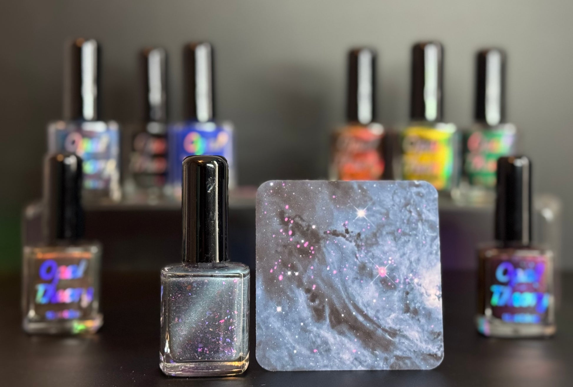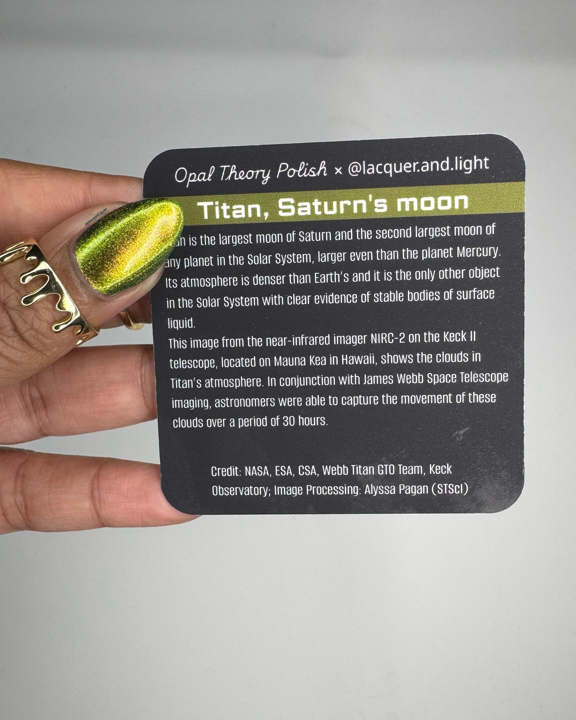 We designed 2x2 inch info cards to go with each polish. One side has the inspiration image, while the other side has a description of the space object written by @lacquer.and.light herself! They have that soft-touch finish, so they feel great. I also know that some people don't want more stuff in their home, which I totally understand, so you can delete them from your cart if you don't want them.