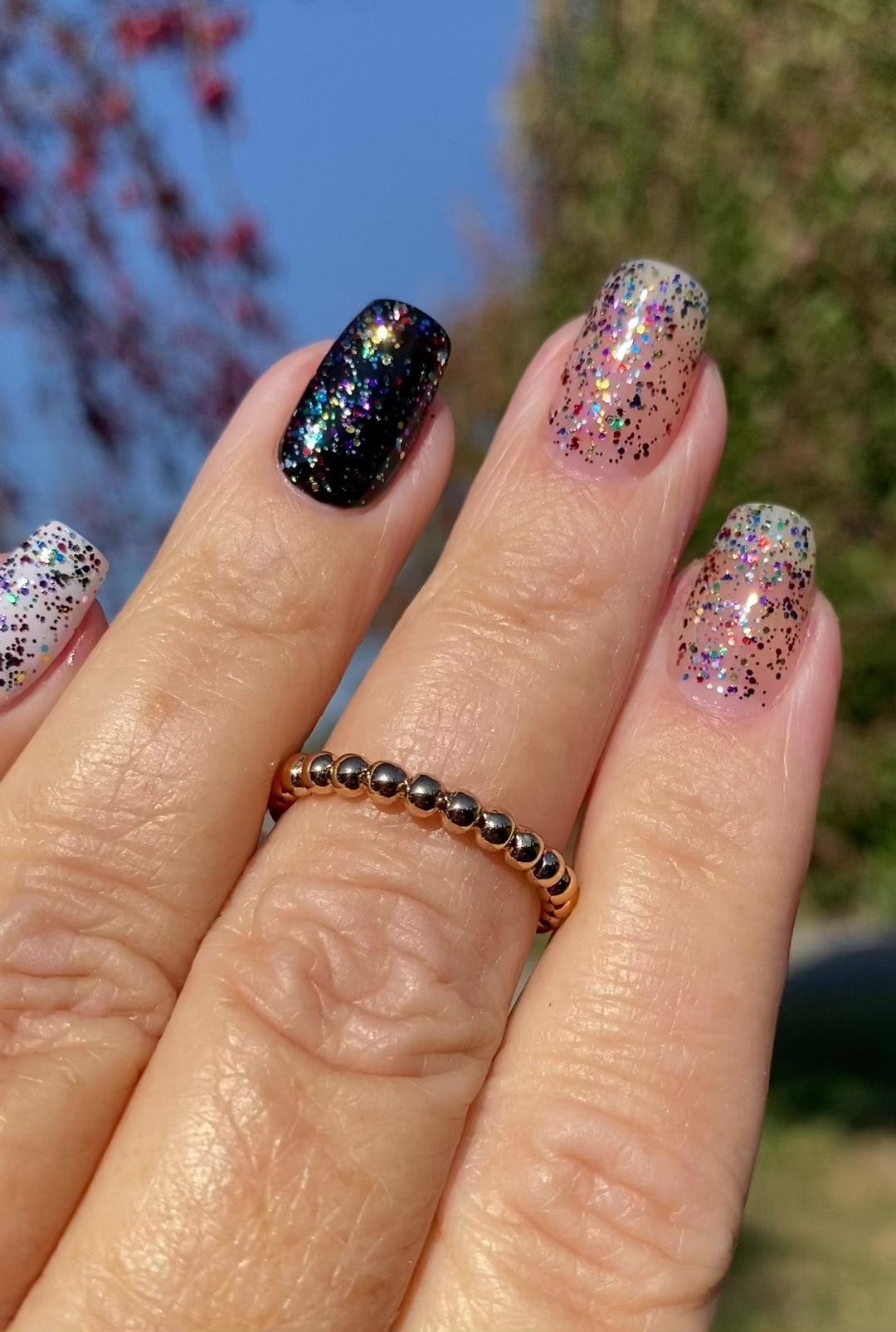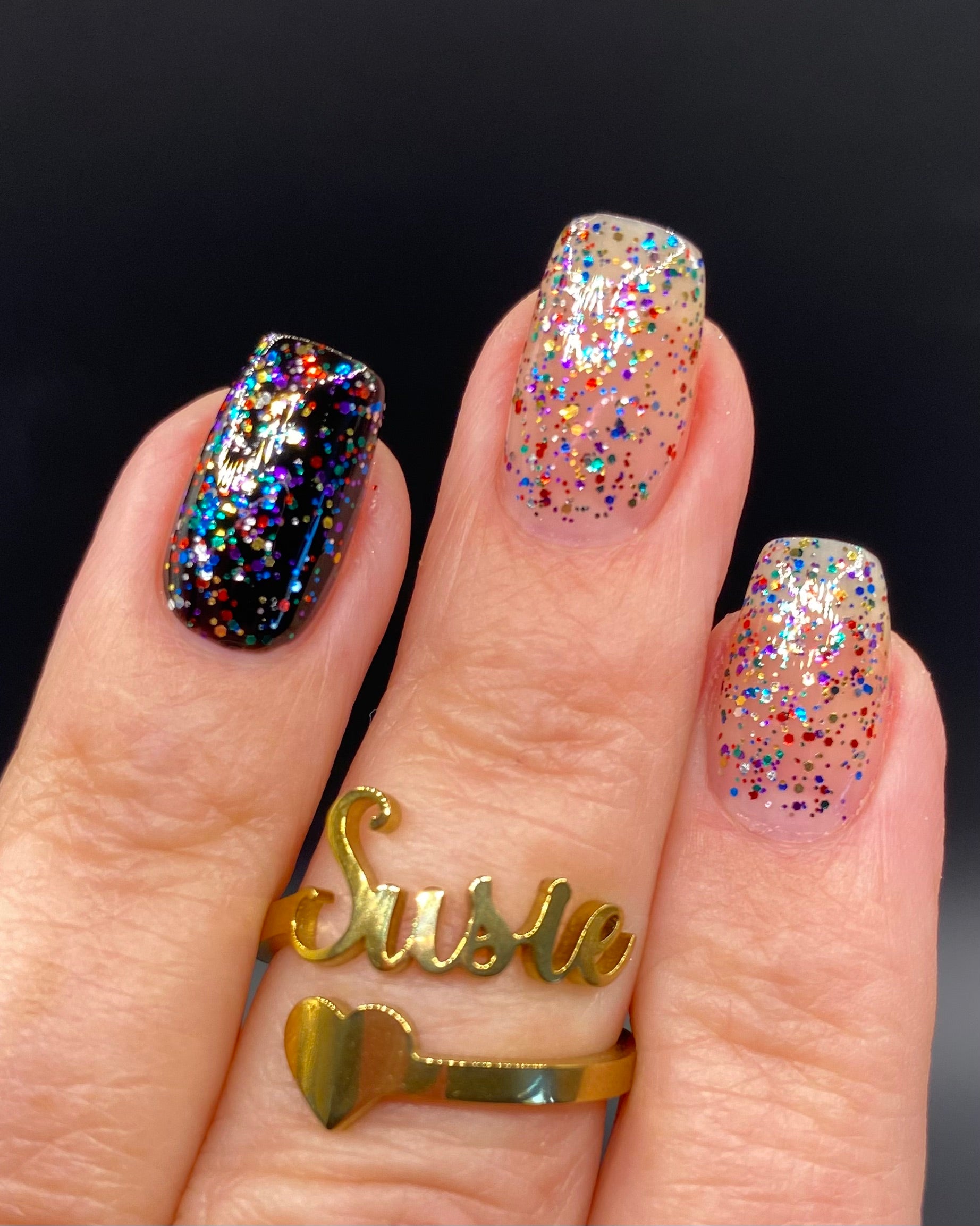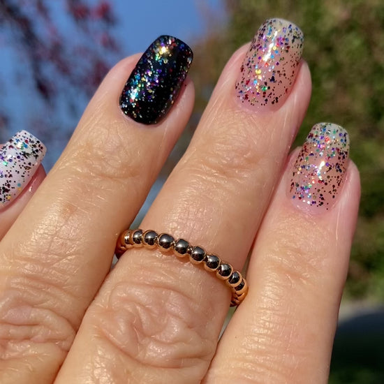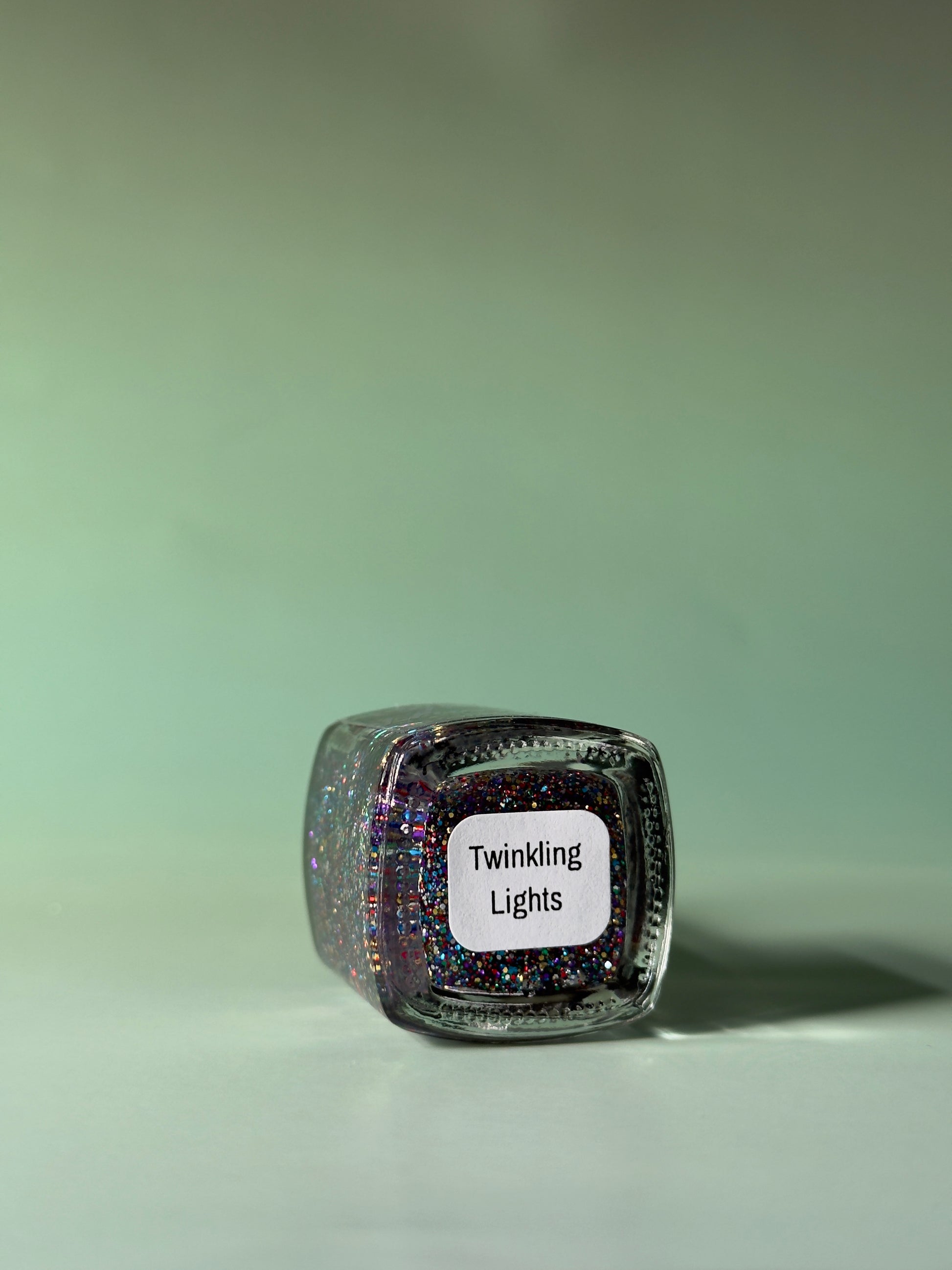 Twinkling Lights is a topper with scattered glitter in classic Christmas lights colors - red, green, blue, purple, gold, and silver in two different hex glitter sizes. Layer it over any color you like, or just on your nails!