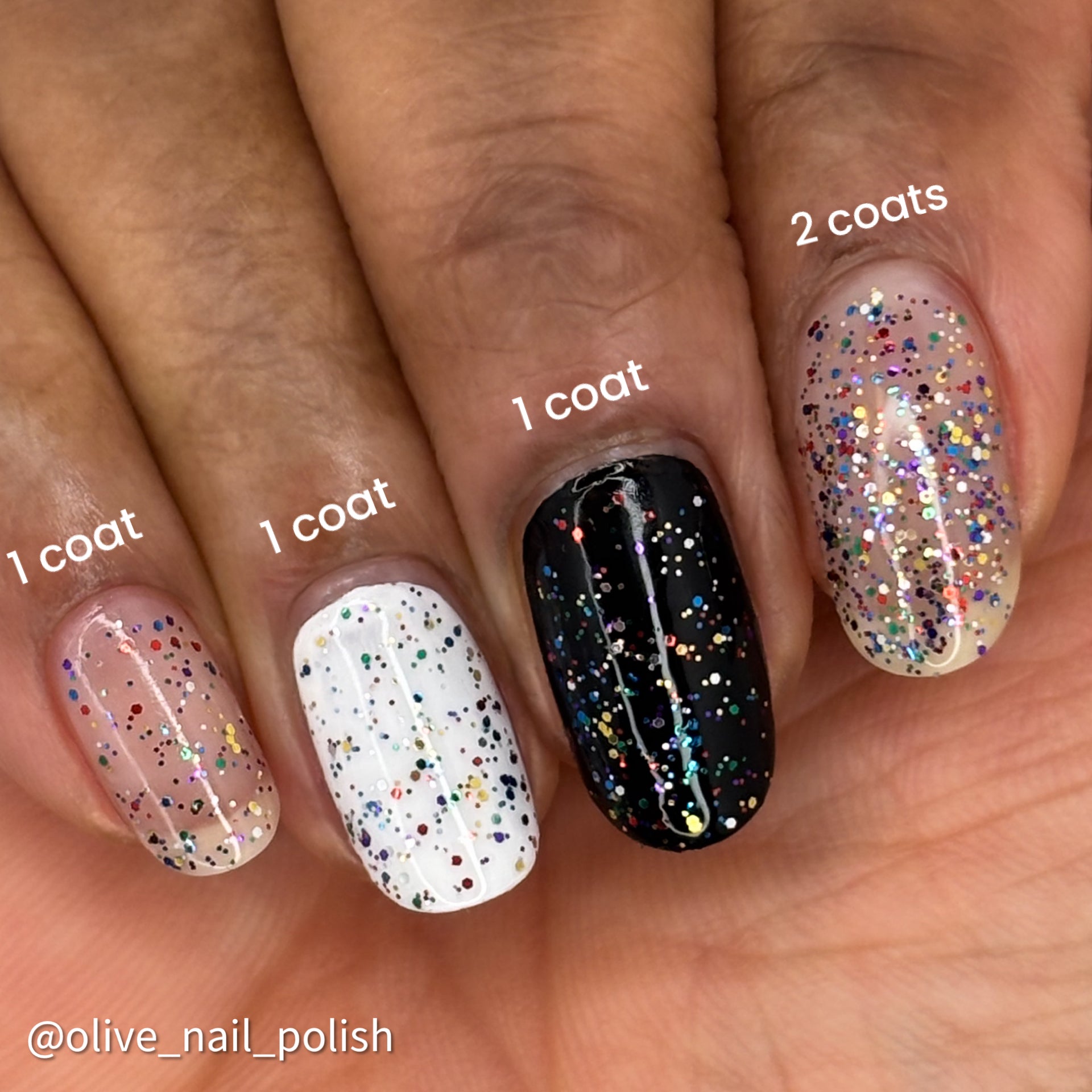 Use 1-2 coats, depending on how dense you want the glitter particles.