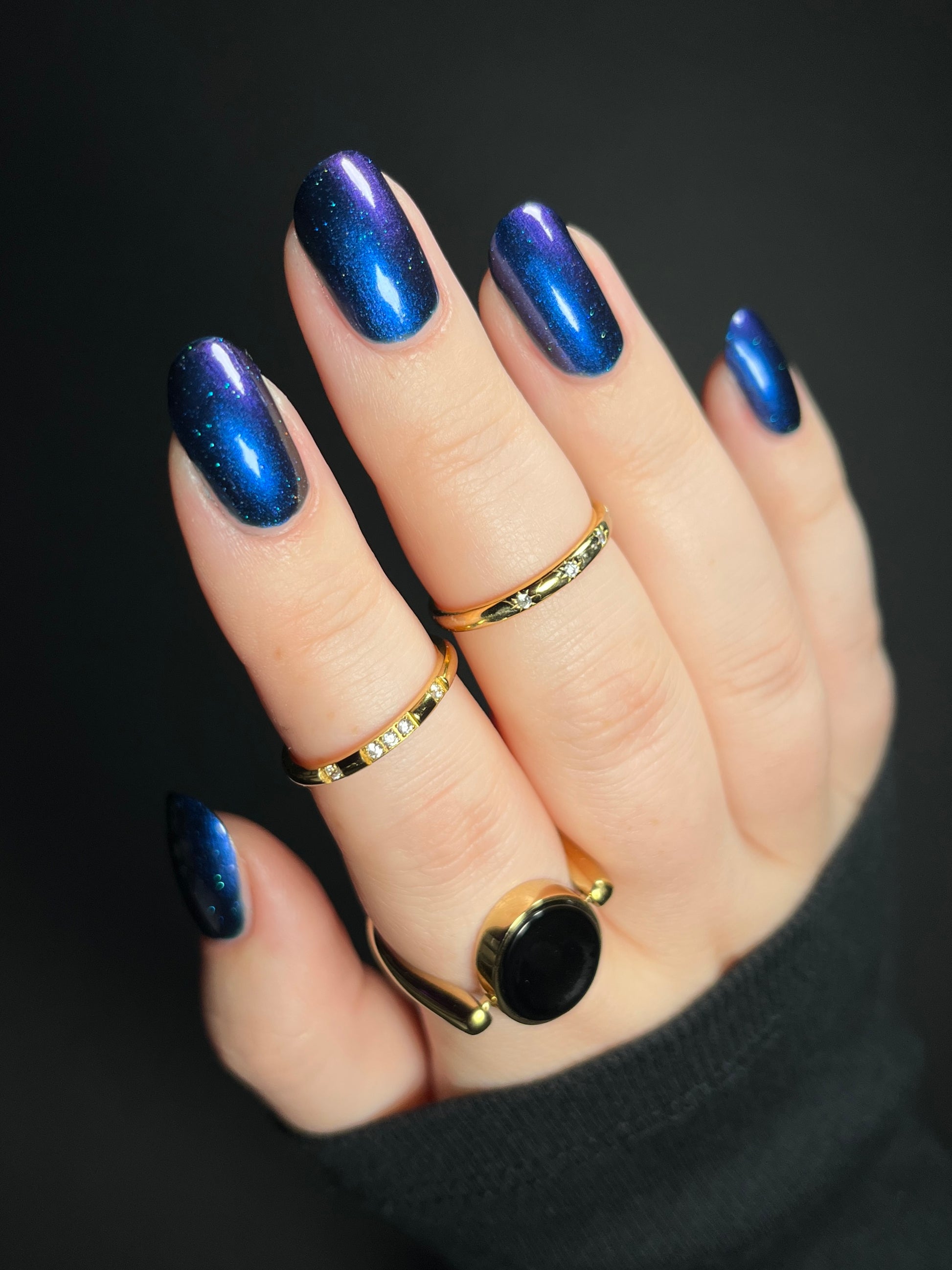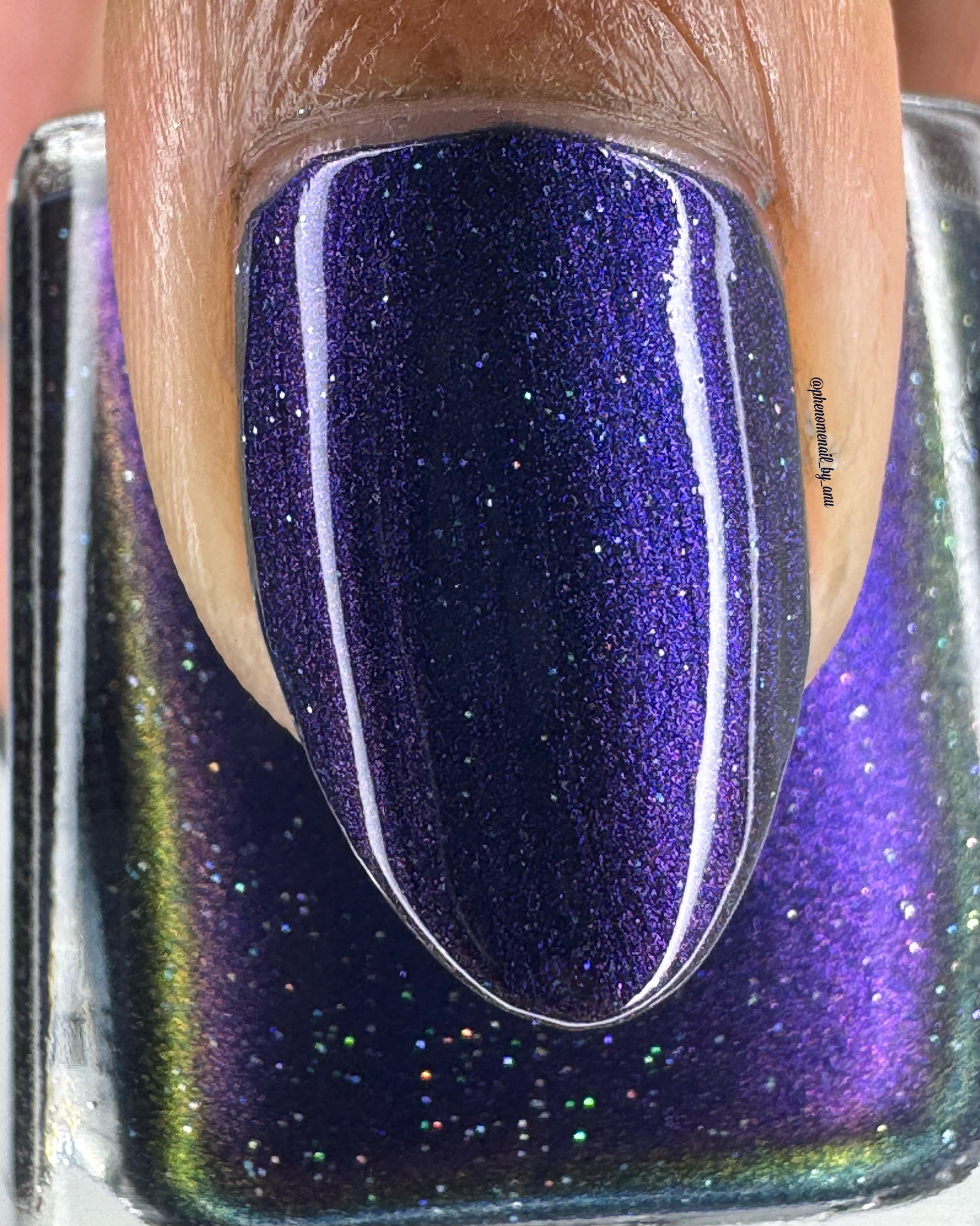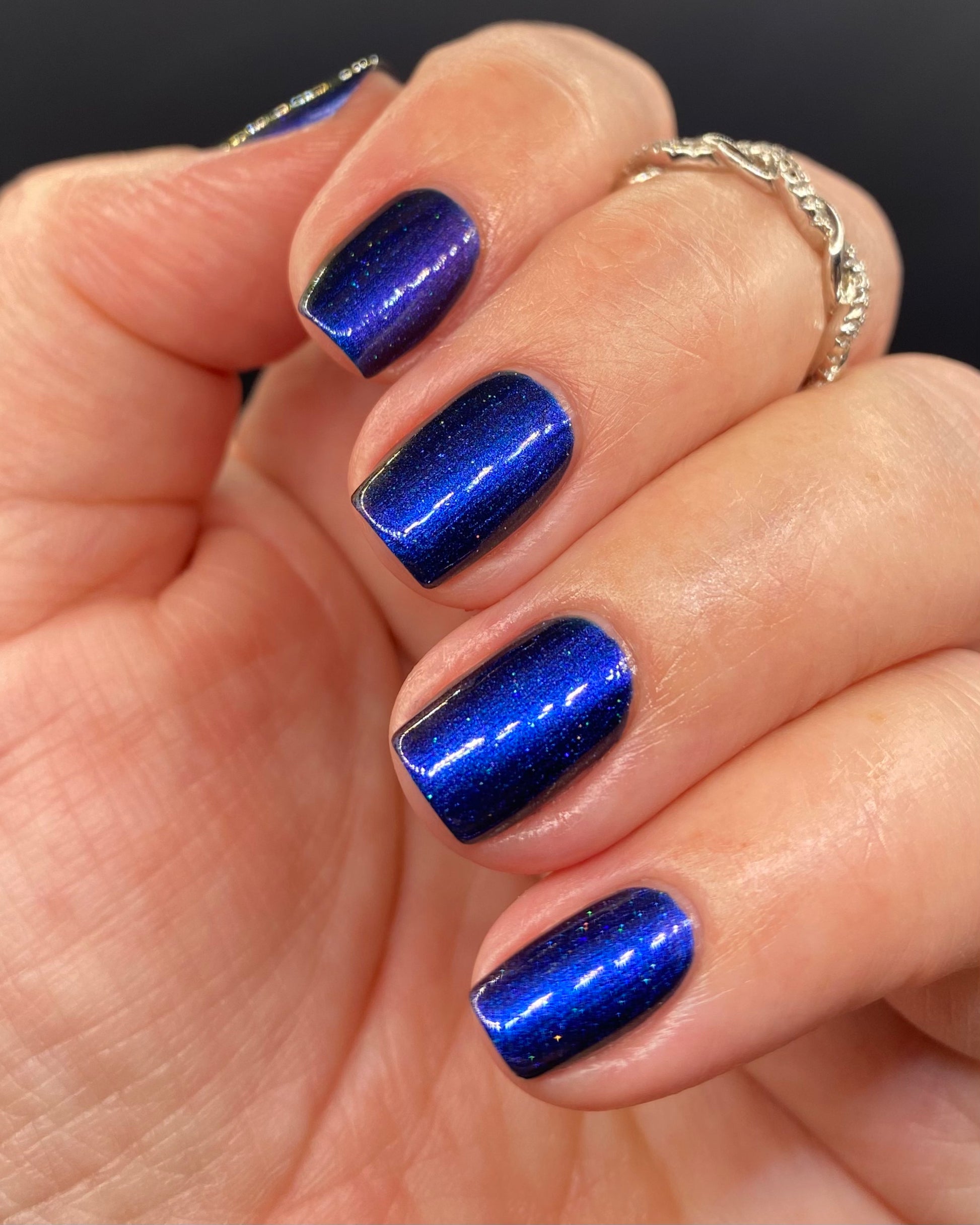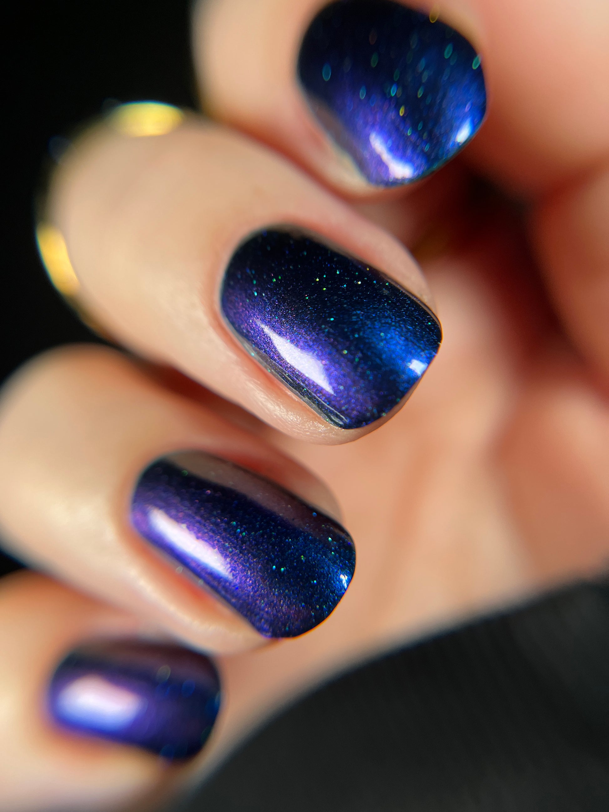 Winter's Darkest Night is a deep blue to purple multichrome crelly nail polish with scattered silver holo, inspired by a clear night sky late on the winter solstice. You may notice slight pink shifts at extreme angles. Full coverage in two coats, and dries glossy