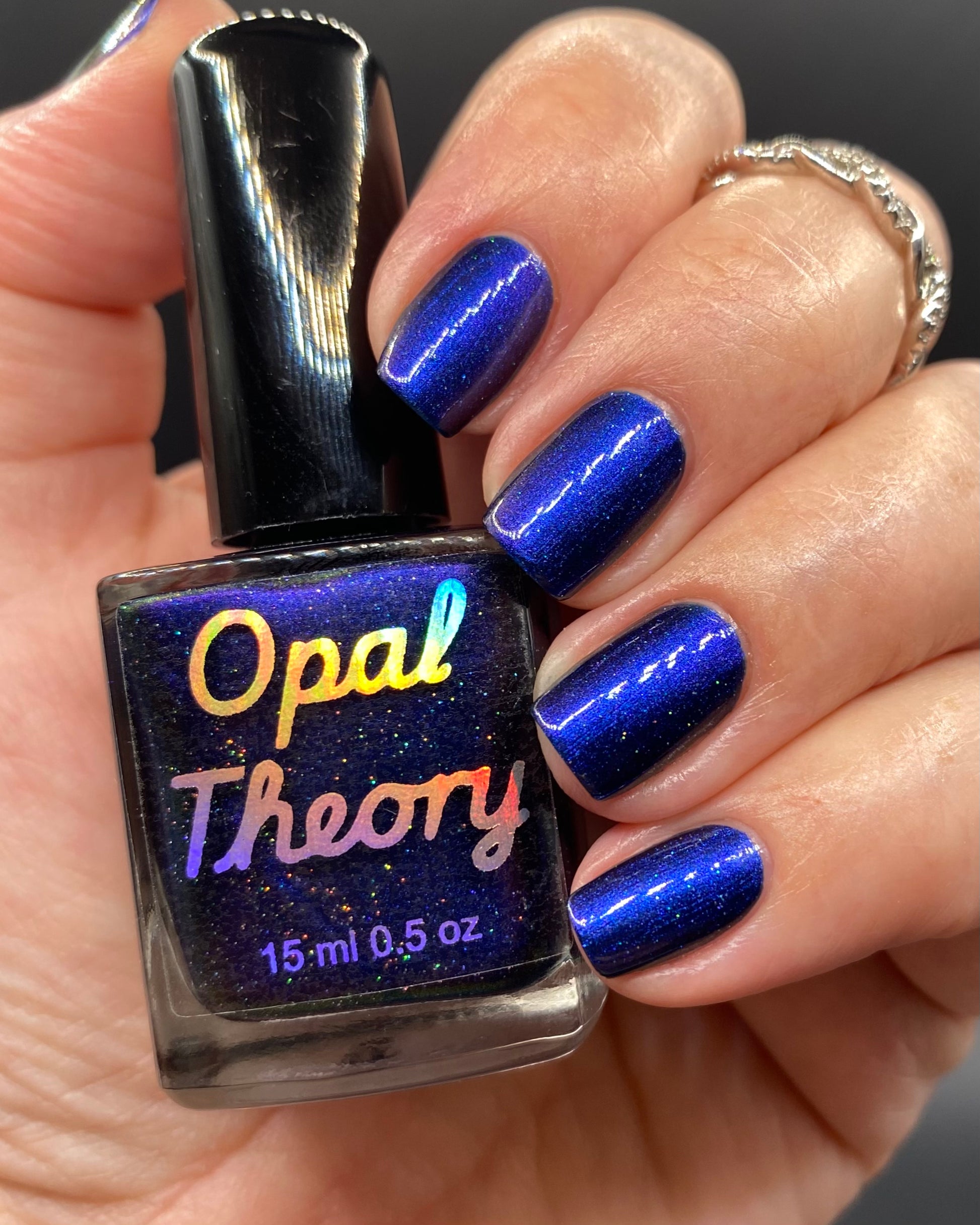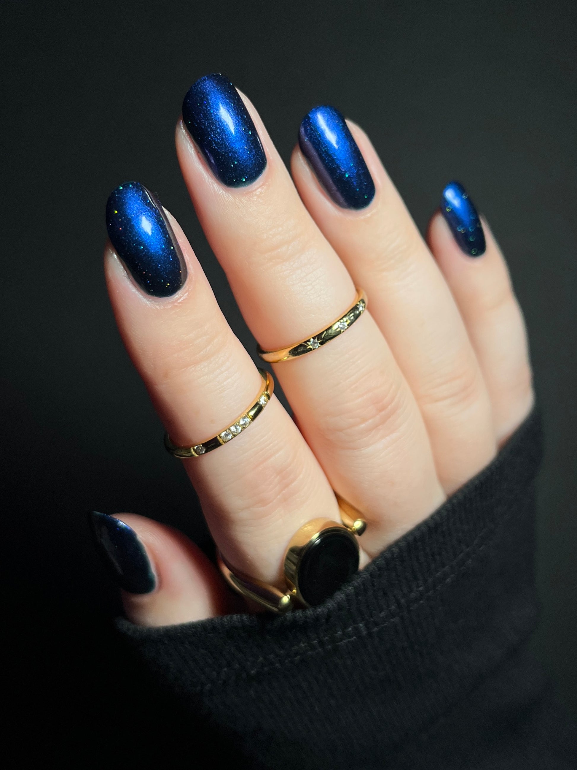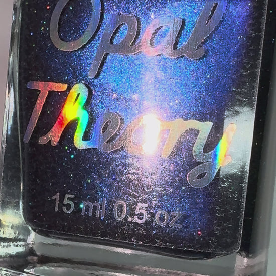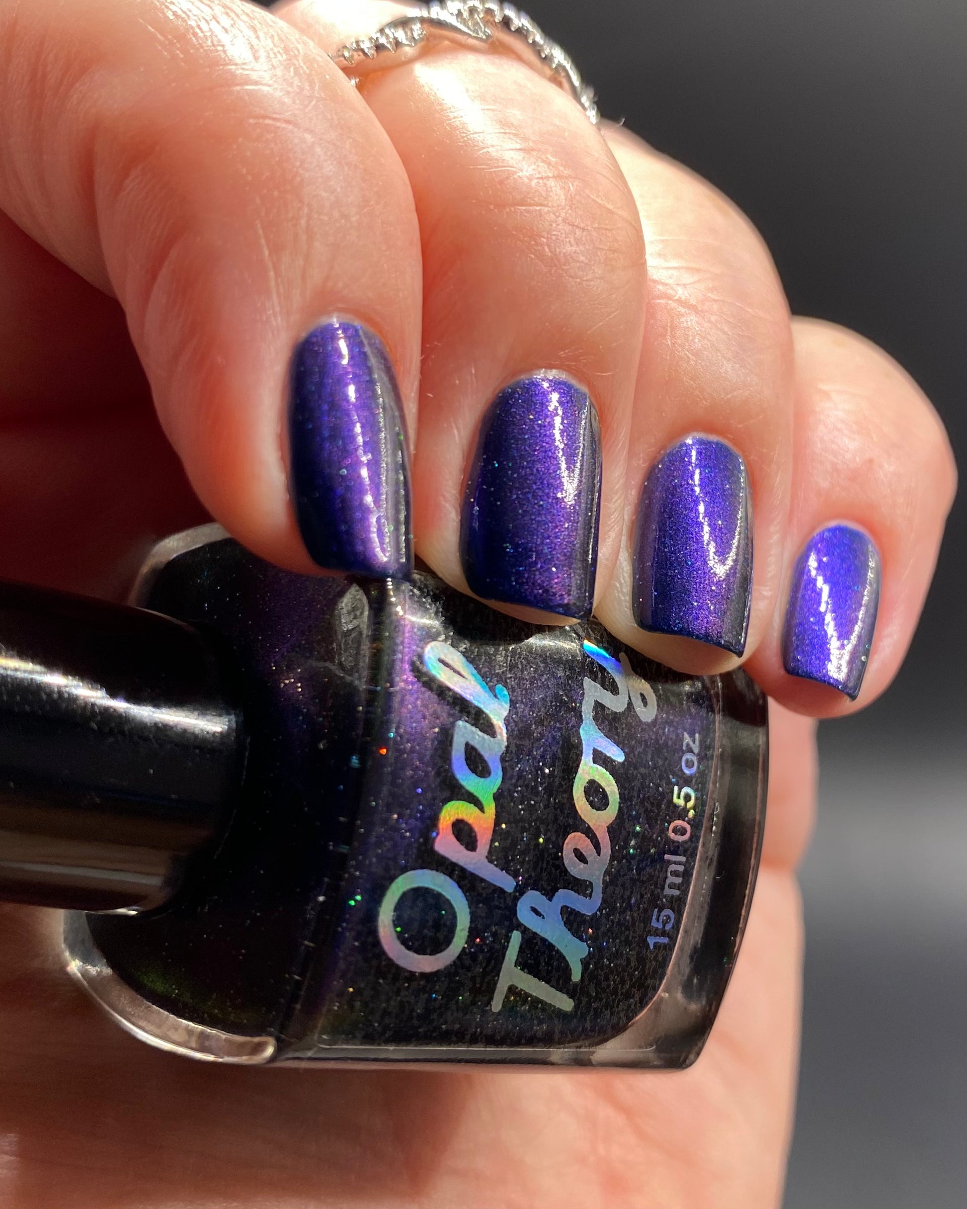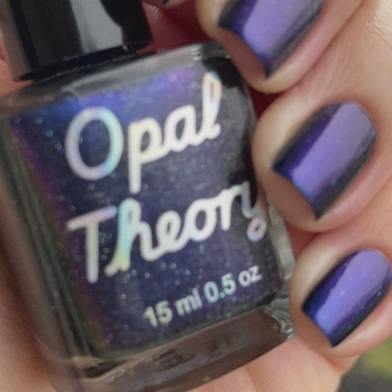 Winter's Darkest Night is a deep blue to purple multichrome crelly nail polish with scattered silver holo, inspired by a clear night sky late on the winter solstice. You may notice slight pink shifts at extreme angles. Full coverage in two coats, and dries glossy
