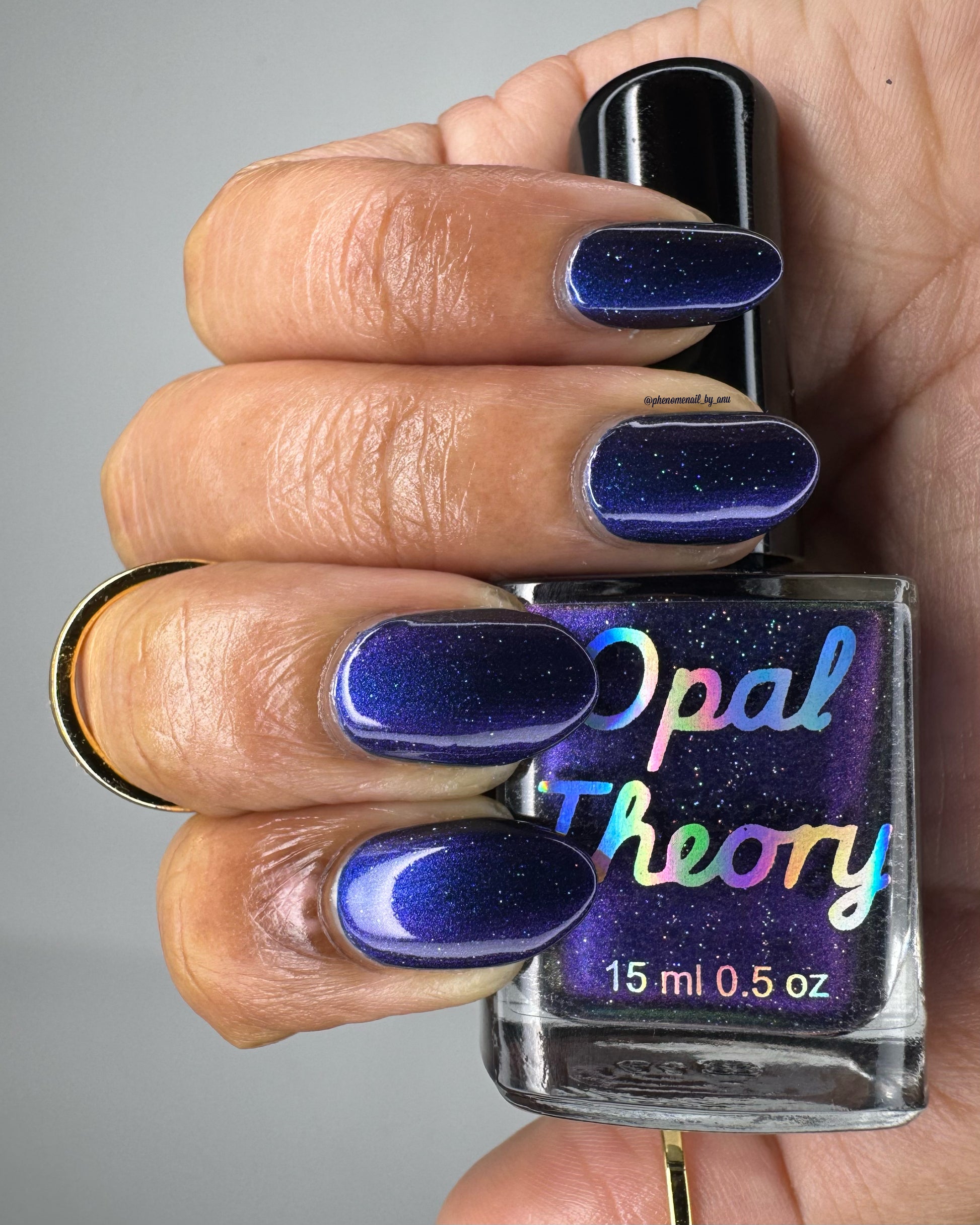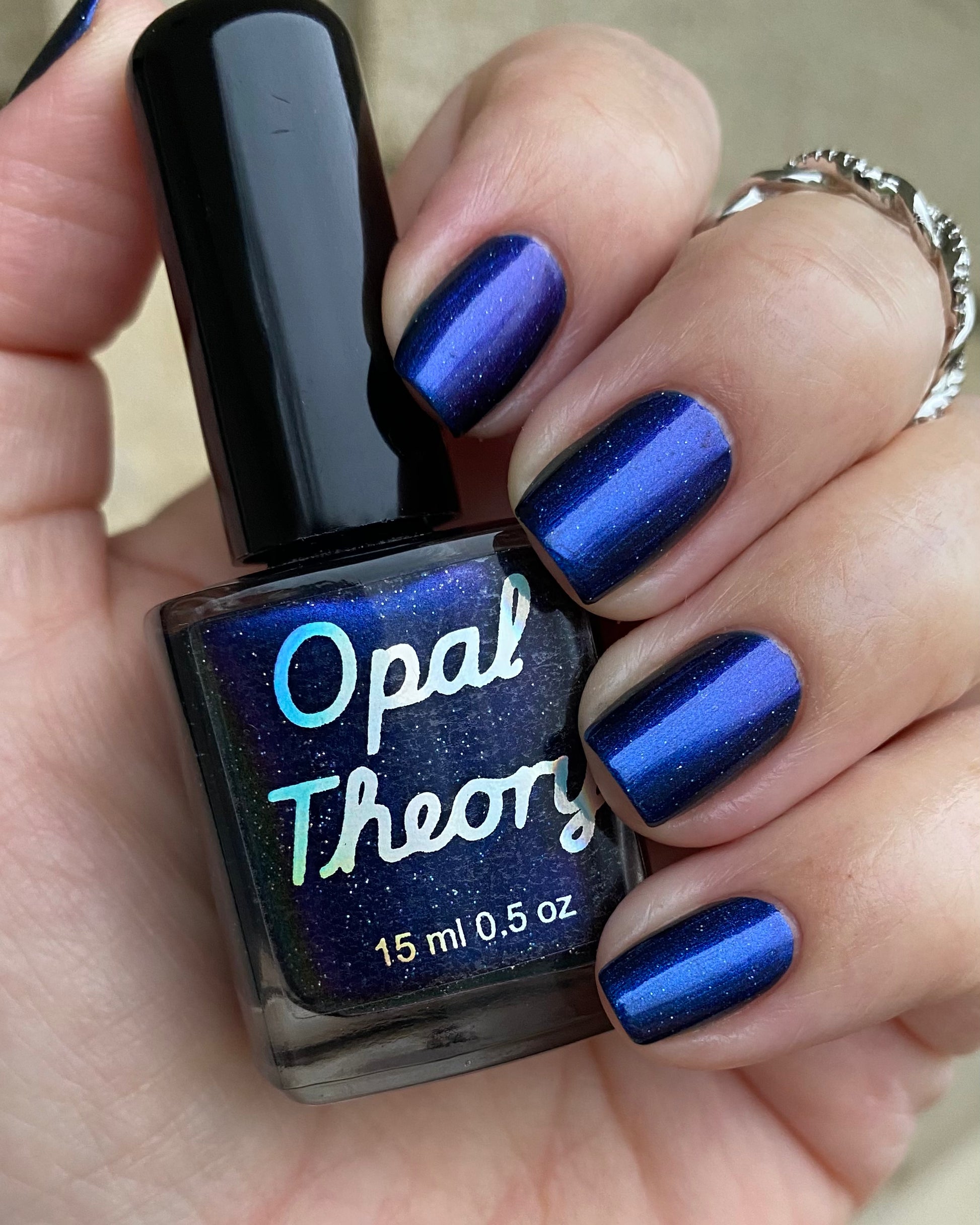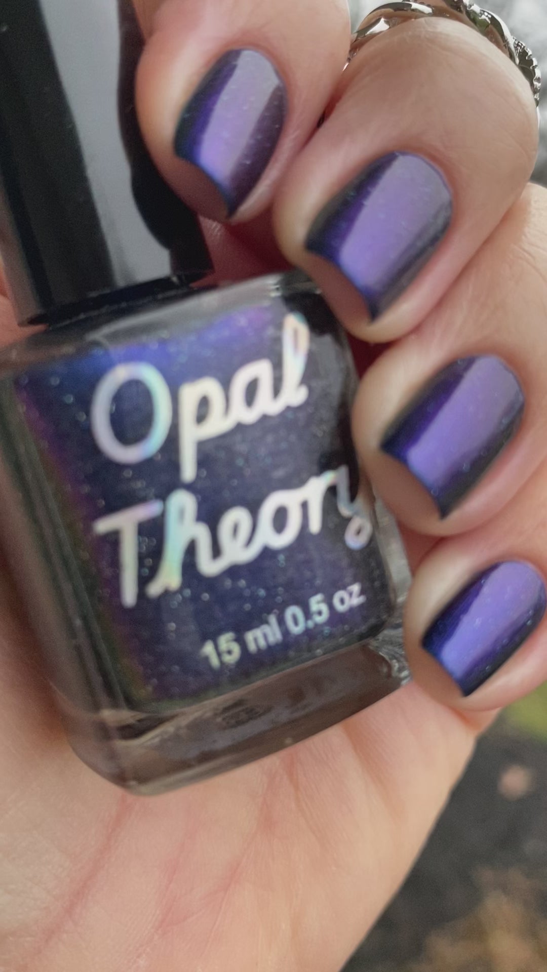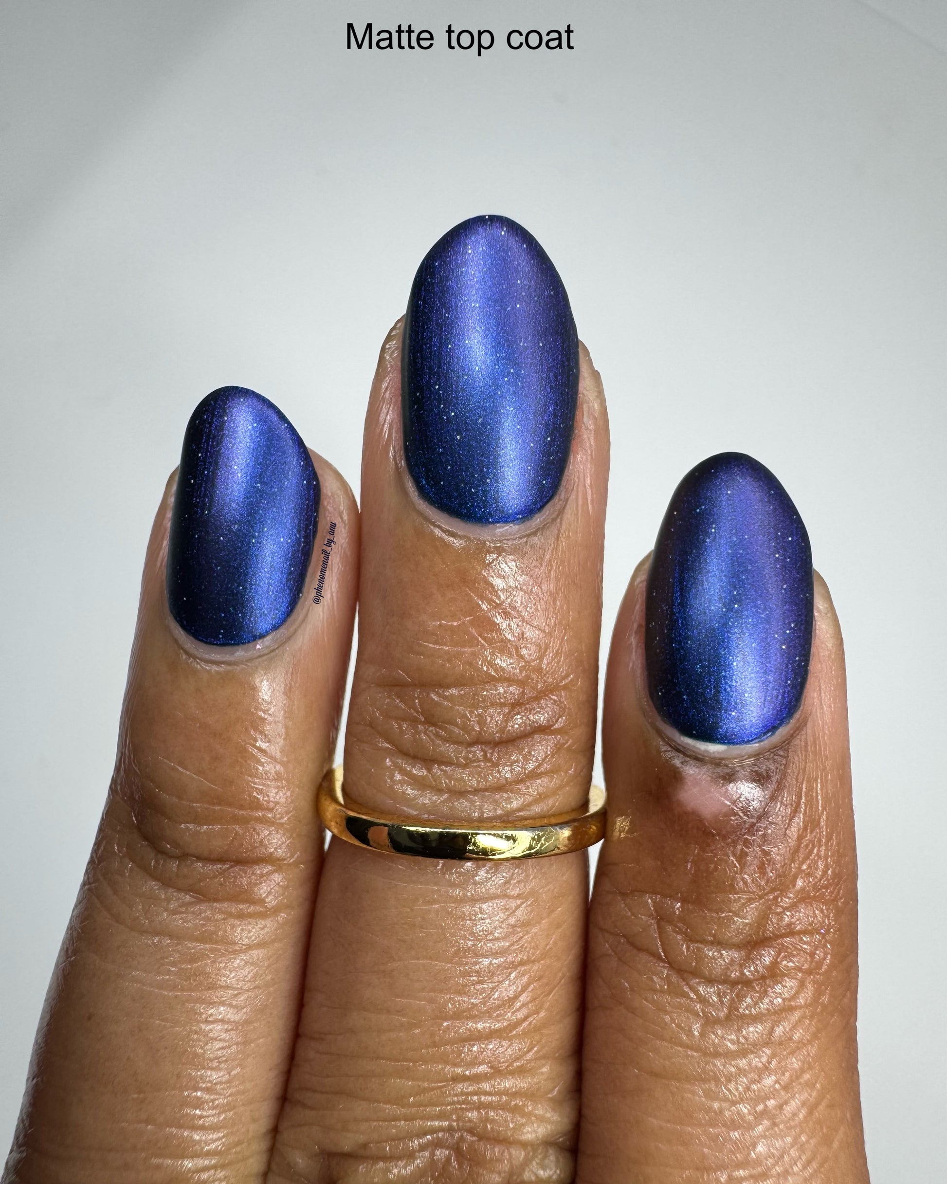 Winter's Darkest Night is a deep blue to purple multichrome crelly nail polish with scattered silver holo, inspired by a clear night sky late on the winter solstice. You may notice slight pink shifts at extreme angles. Full coverage in two coats, and dries glossy